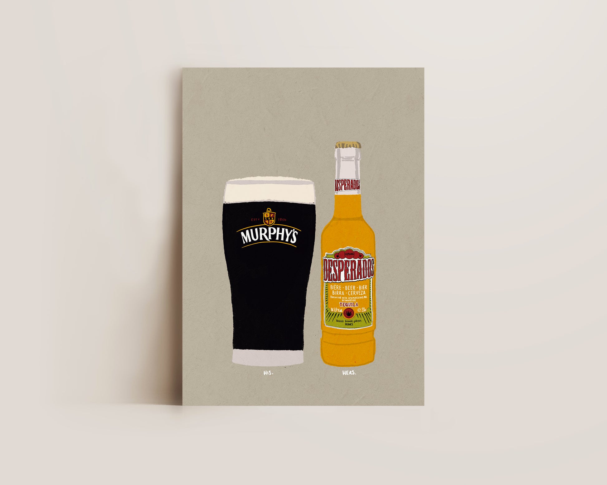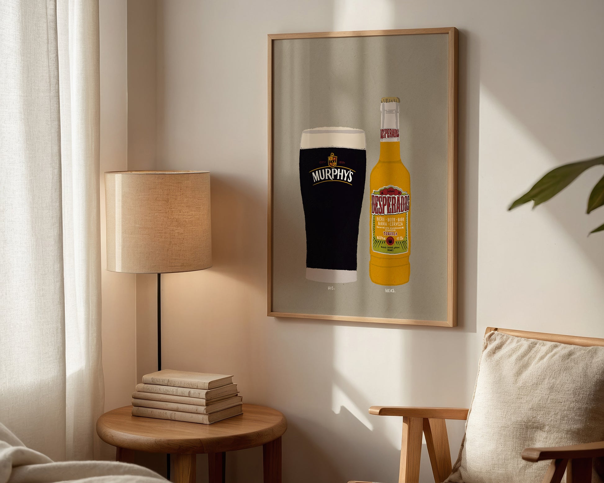 A Murphy's & Desperados print featuring hand drawn pint of Murphy's alongside a bottle of Desperados, set against a pale green/grey background, the perfect modern kitchen print. Printed on archival matte 240gsm paper. Available in multiple sizes, with framed or unframed options. Exclusively designed by one of our artists at our studio.