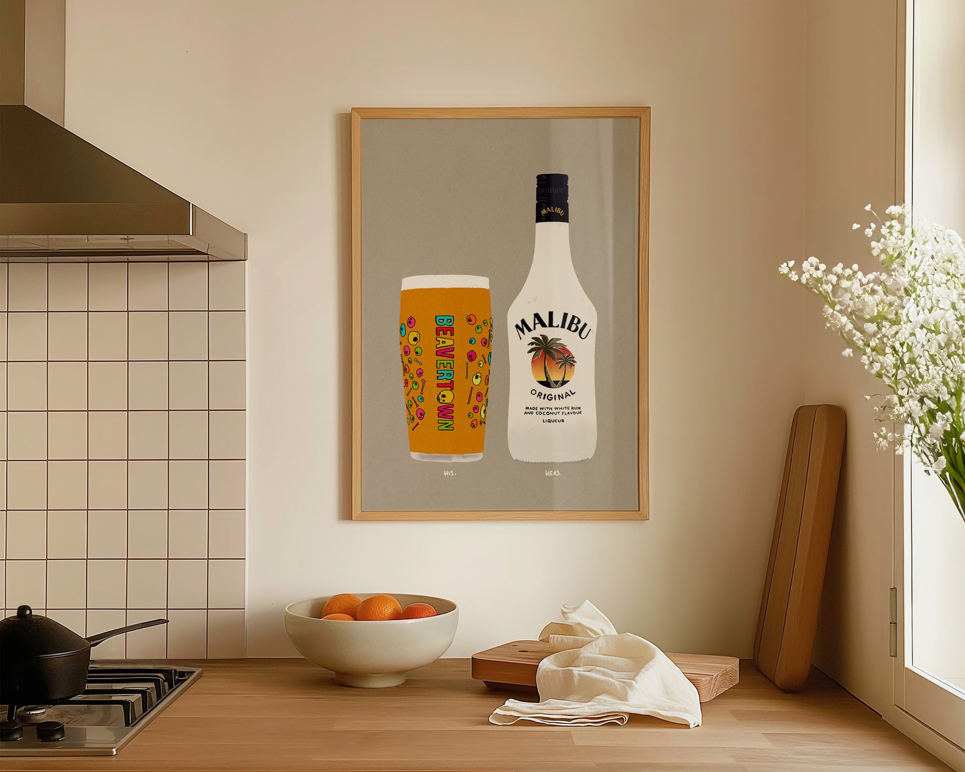 A Neck Oil and Malibu print featuring hand drawn pint of Neck Oil alongside a bottle of Malibu, set against a pale green/grey background, the perfect modern kitchen print. Printed on archival matte 240gsm paper. Available in multiple sizes, with framed or unframed options. Exclusively designed by one of our artists at our studio.