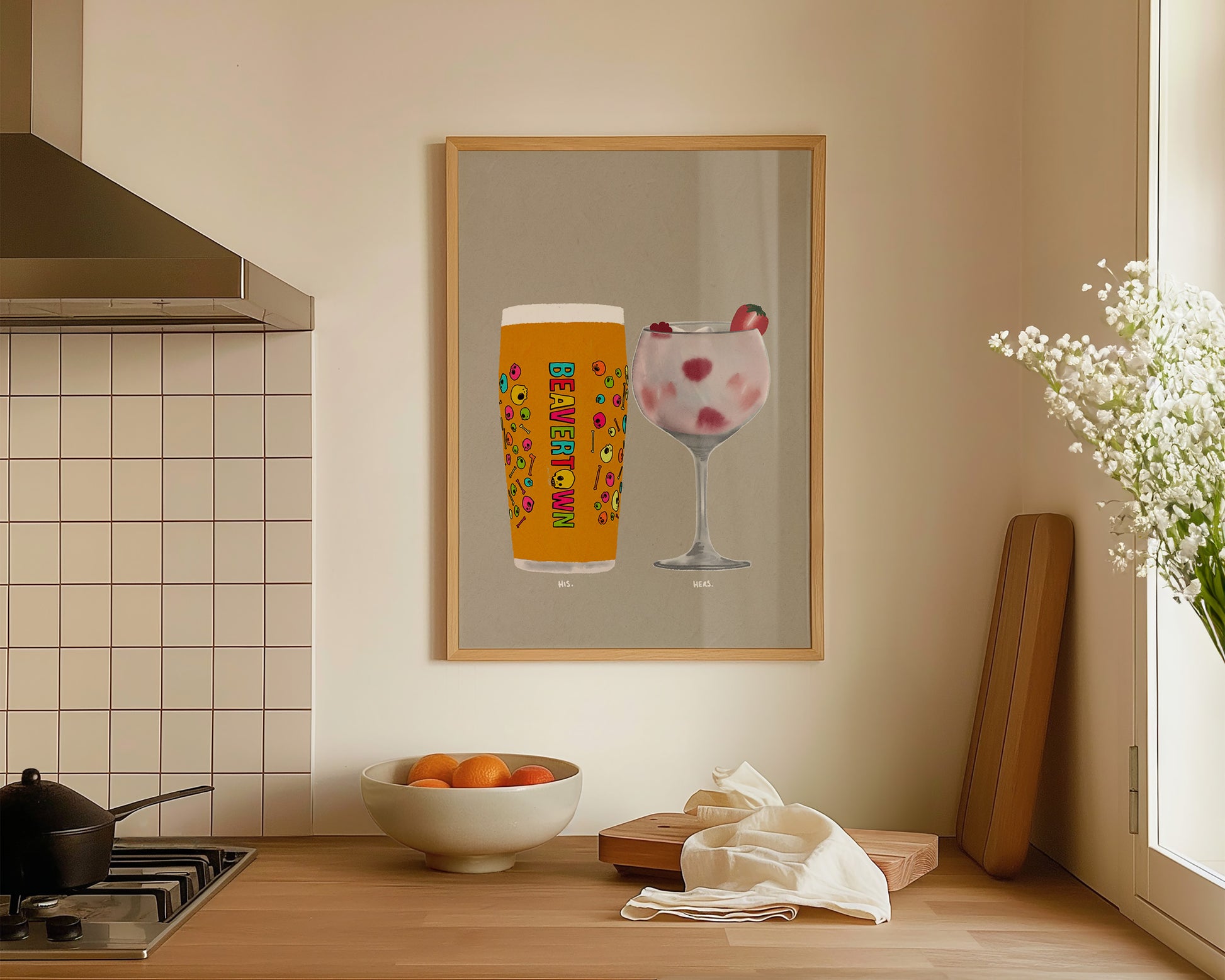 A Neck Oil and Pink Gin print featuring hand drawn pint of Neck Oil alongside a glass of Pink Gin, set against a pale green/grey background, the perfect modern kitchen print. Printed on archival matte 240gsm paper. Available in multiple sizes, with framed or unframed options. Exclusively designed by one of our artists at our studio.