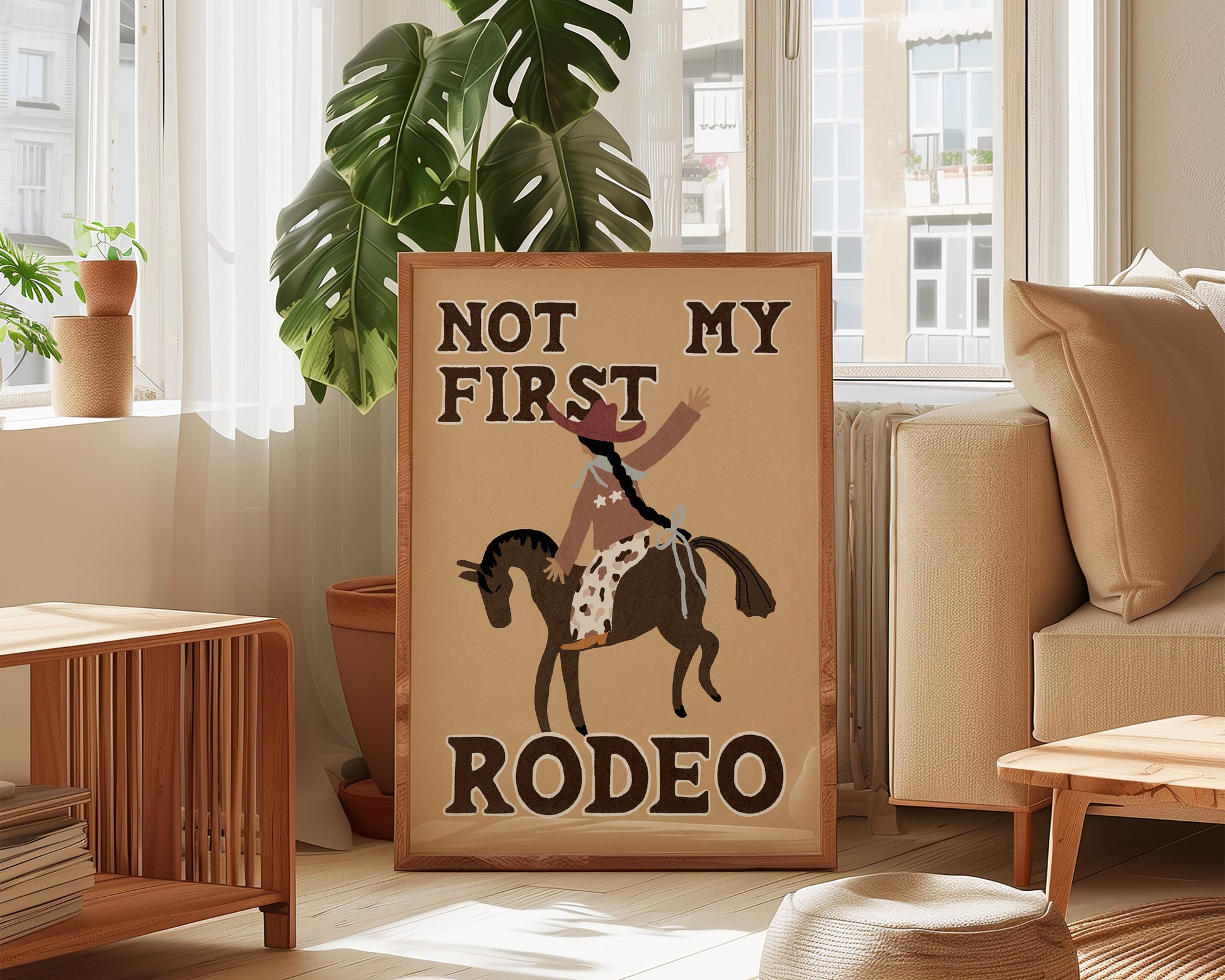 A cowgirl print featuring hand drawn cow girl riding a horse, with brown text contrasted with a beige background. The perfect cowgirl themed print. Printed on archival matte 240gsm paper. Available in multiple sizes, with framed or unframed options. Exclusively designed by one of our artists at our studio.