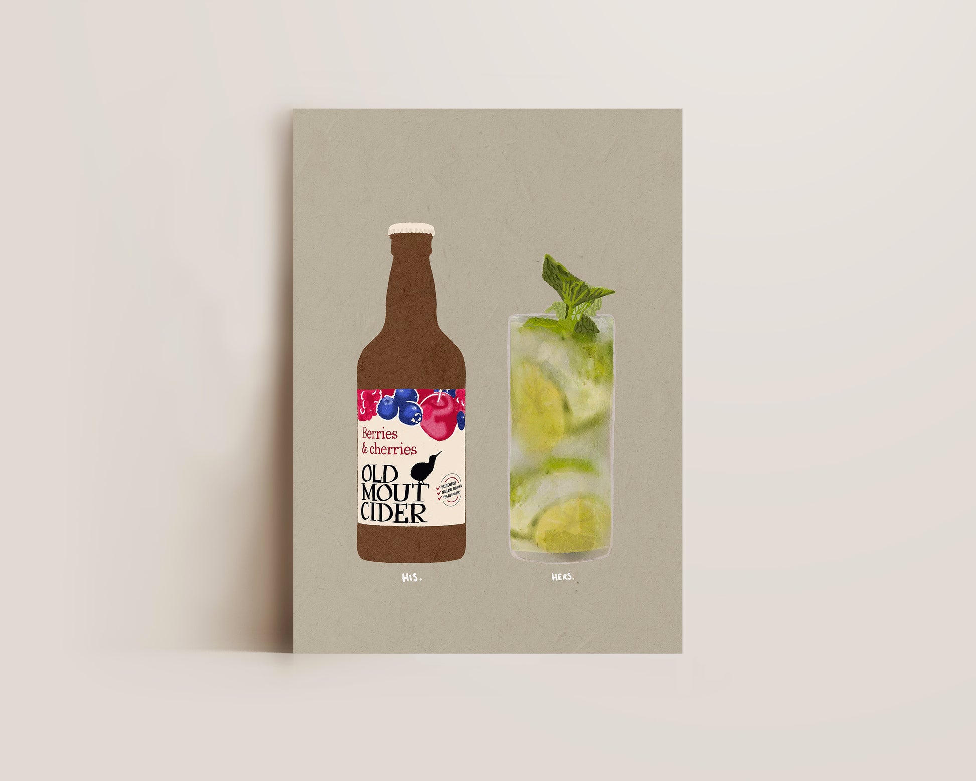 A cider and cocktail print featuring hand drawn bottle of Old Mout Berries & Cherries alongside a Mojito cocktail, set against a pale green/grey background, the perfect modern kitchen print. Printed on archival matte 240gsm paper. Available in multiple sizes, with framed or unframed options. Exclusively designed by one of our artists at our studio.