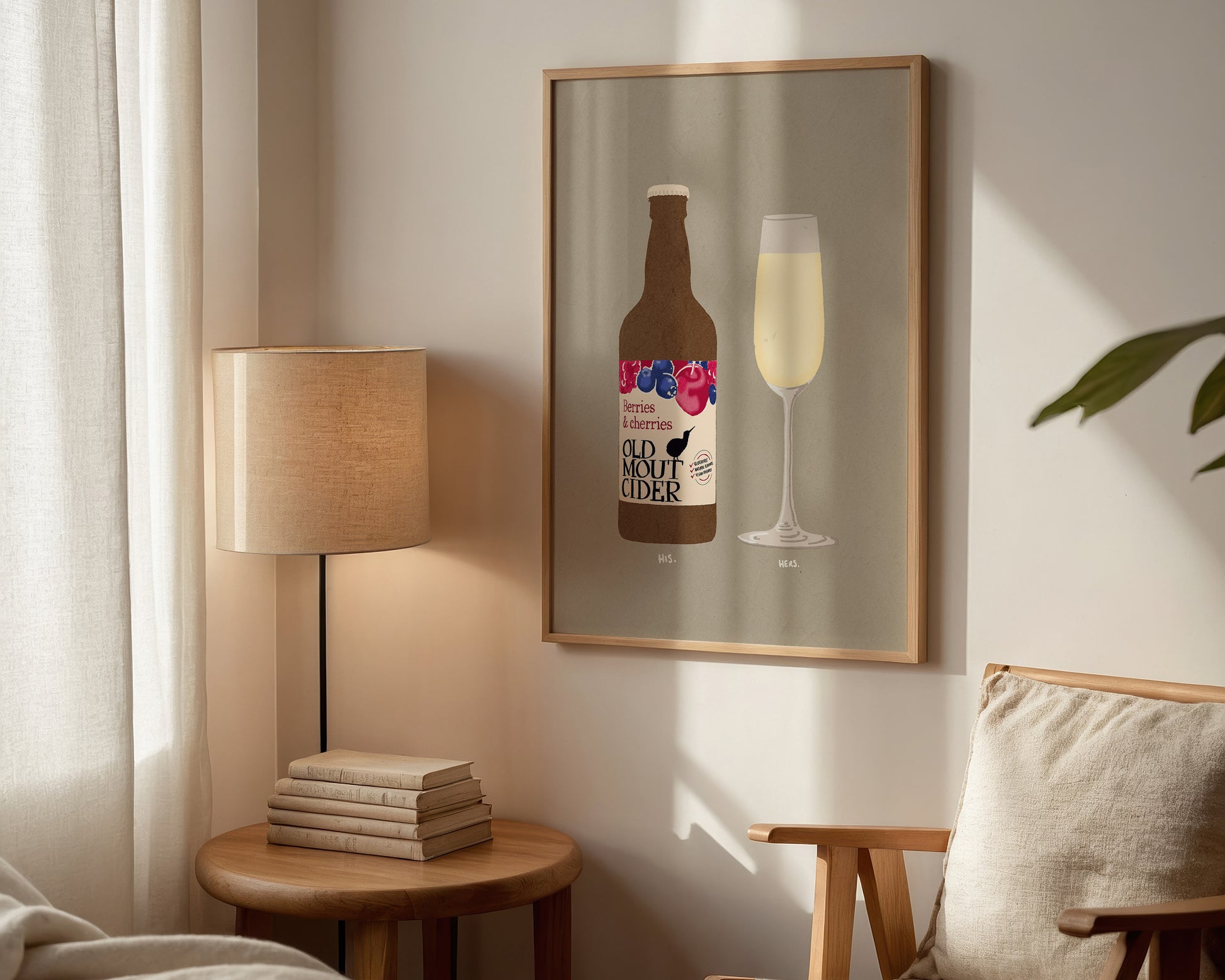 A cider and prosecco print featuring hand drawn bottle of Old Mout Berries & Cherries alongside a glass of Prosecco, set against a pale green/grey background, the perfect modern kitchen print. Printed on archival matte 240gsm paper. Available in multiple sizes, with framed or unframed options. Exclusively designed by one of our artists at our studio.