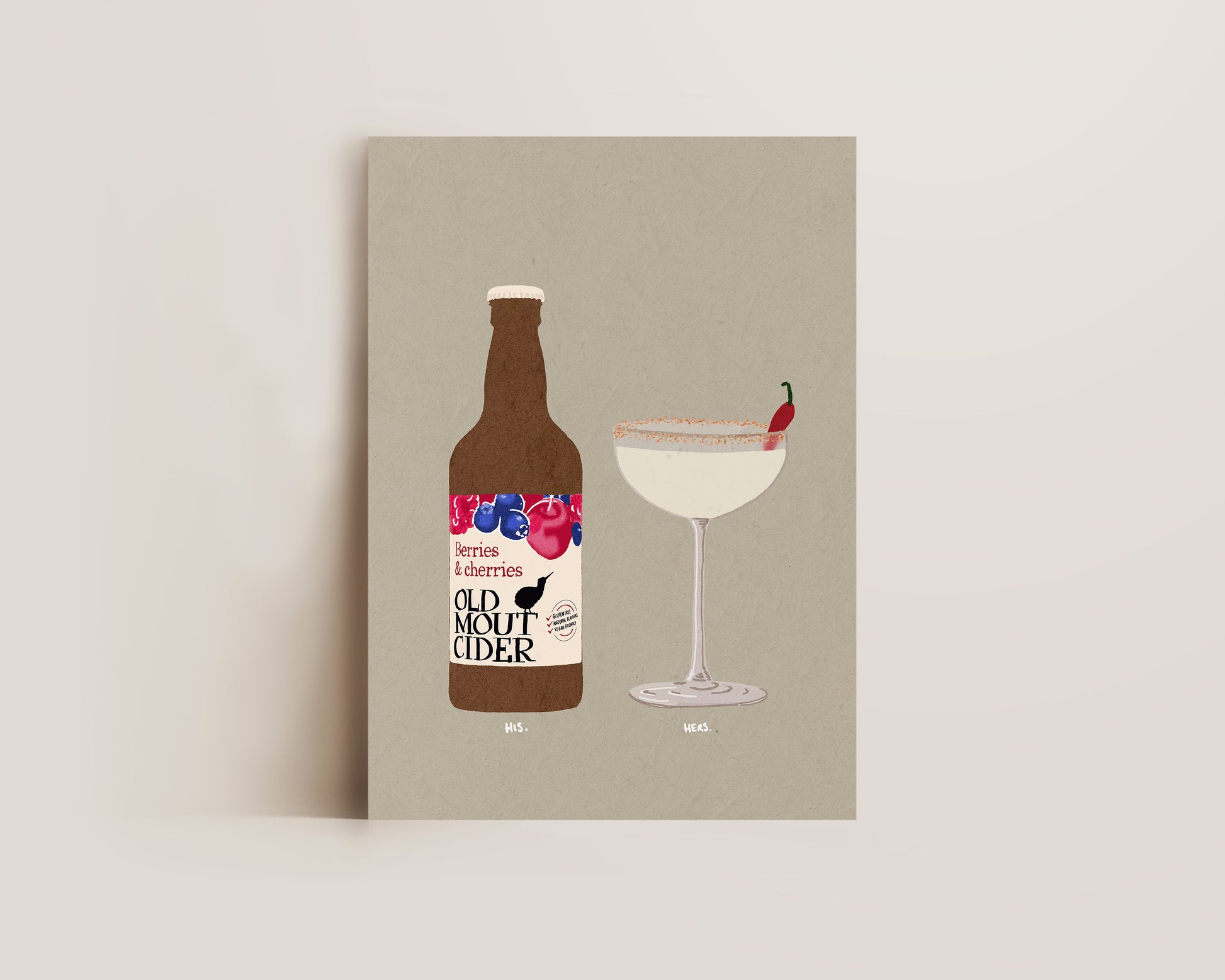 A cider and cocktail print featuring hand drawn bottle of Old Mout Berries & Cherries alongside a spicy marg, set against a pale green/grey background, the perfect modern kitchen print. Printed on archival matte 240gsm paper. Available in multiple sizes, with framed or unframed options. Exclusively designed by one of our artists at our studio.