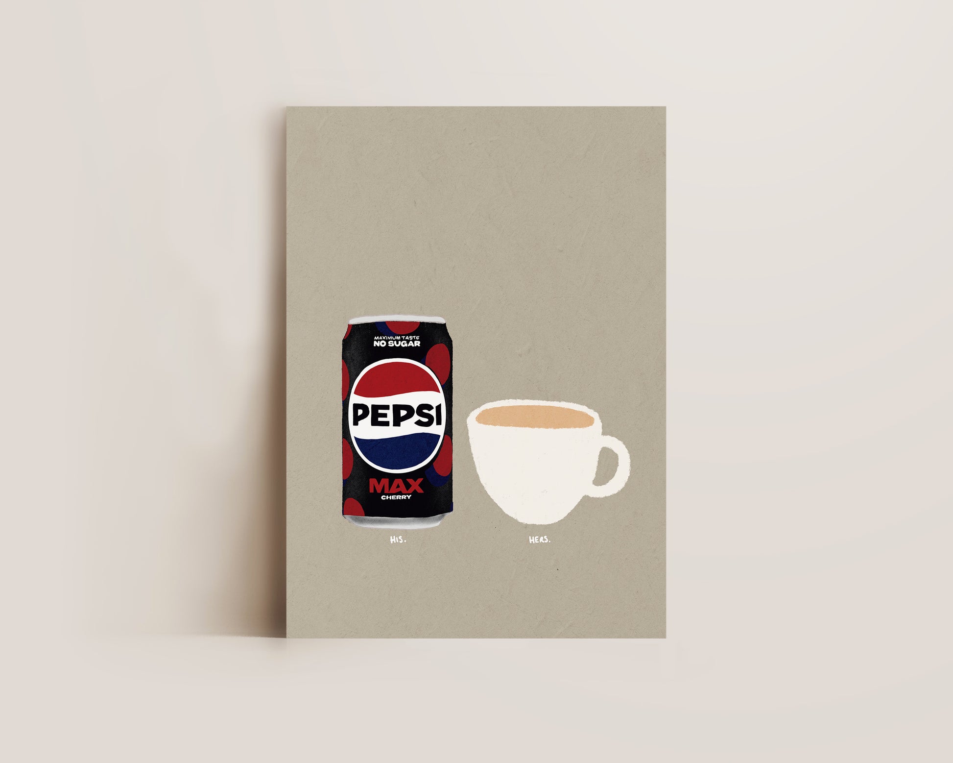 A Pepsi Max Cherry & Cup Of Tea print featuring hand drawn can of Pepsi Max Cherry alongside a cup of tea, set against a pale green/grey background, the perfect modern kitchen print. Printed on archival matte 240gsm paper. Available in multiple sizes, with framed or unframed options. Exclusively designed by one of our artists at our studio.