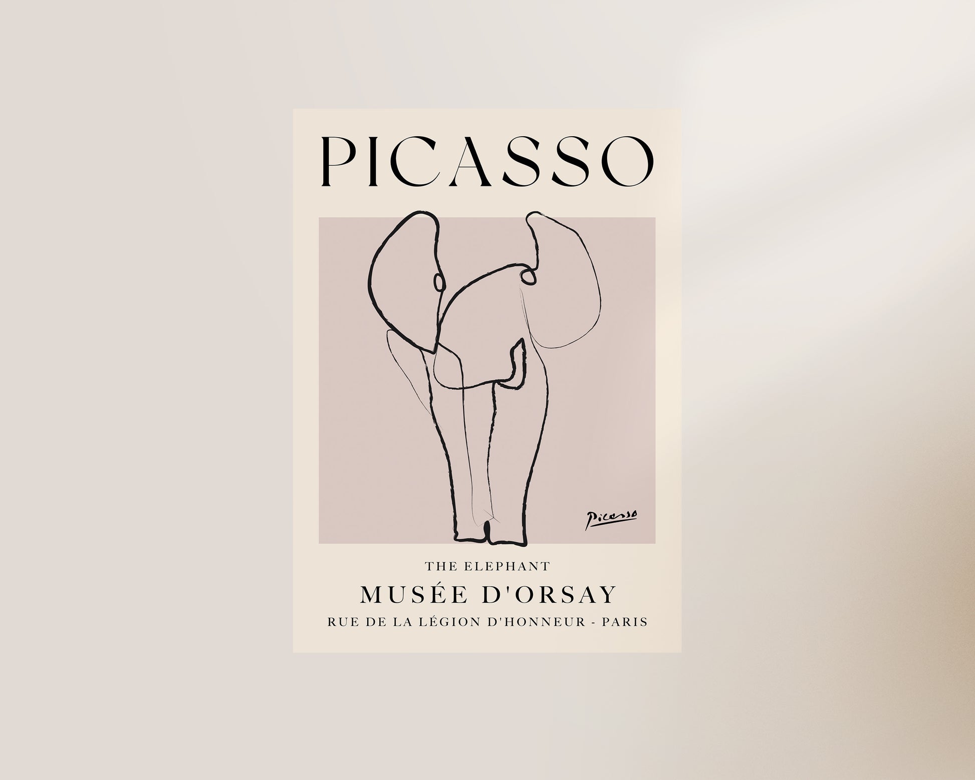 A Picasso line drawn print of an elephant set against a neutral, dusty pink background. Exclusively designed by one of our artists at our studio.