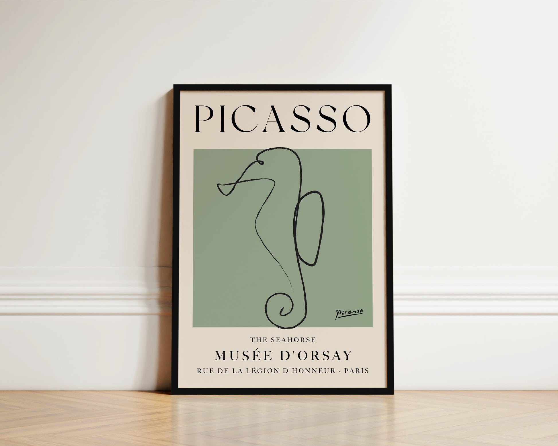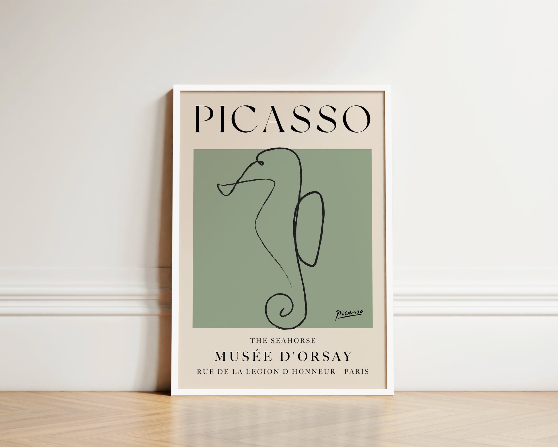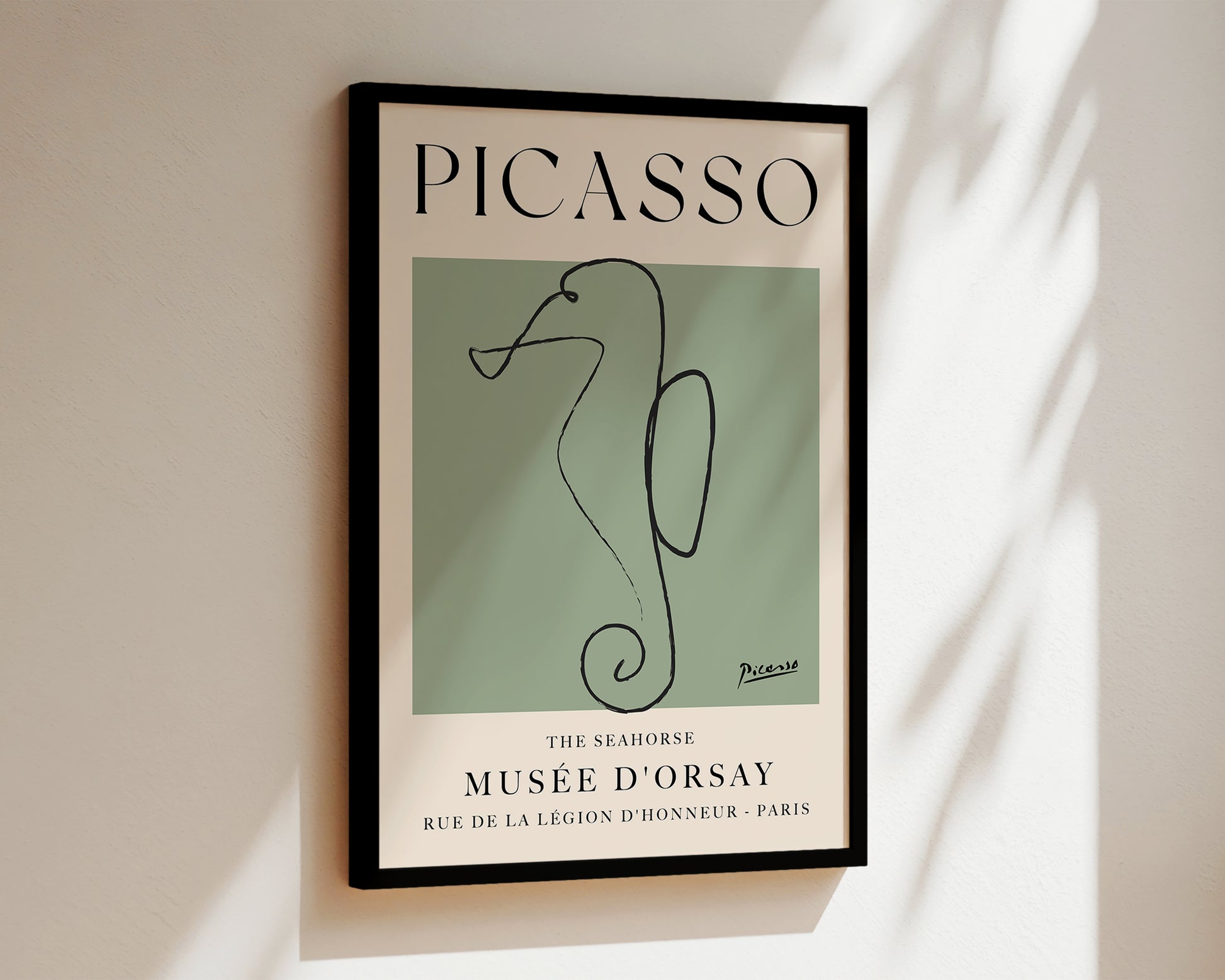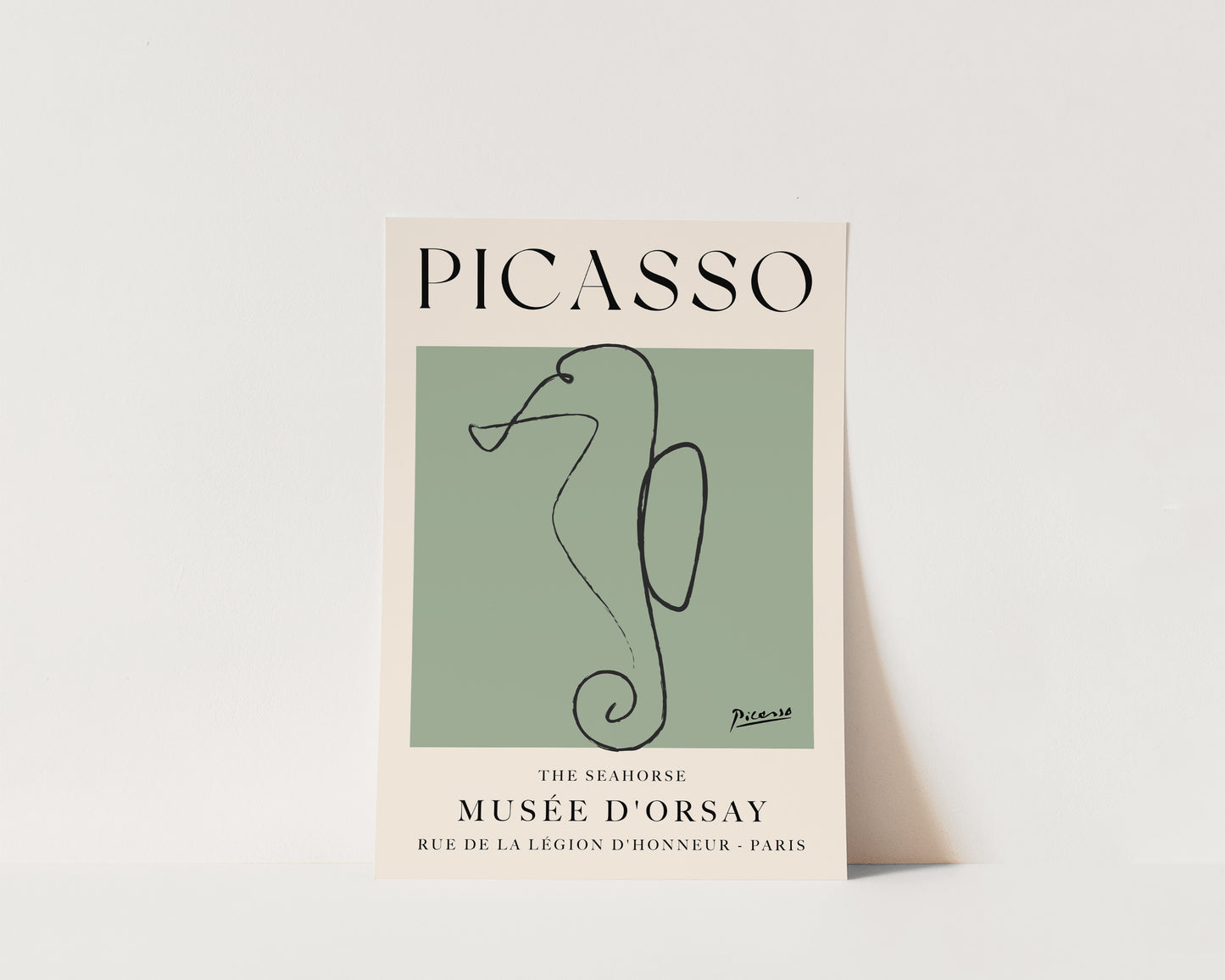 A Pablo Picasso line drawing print of a seahorse set against a neutral, earthy green background. Exclusively designed by one of our artists at our studio.