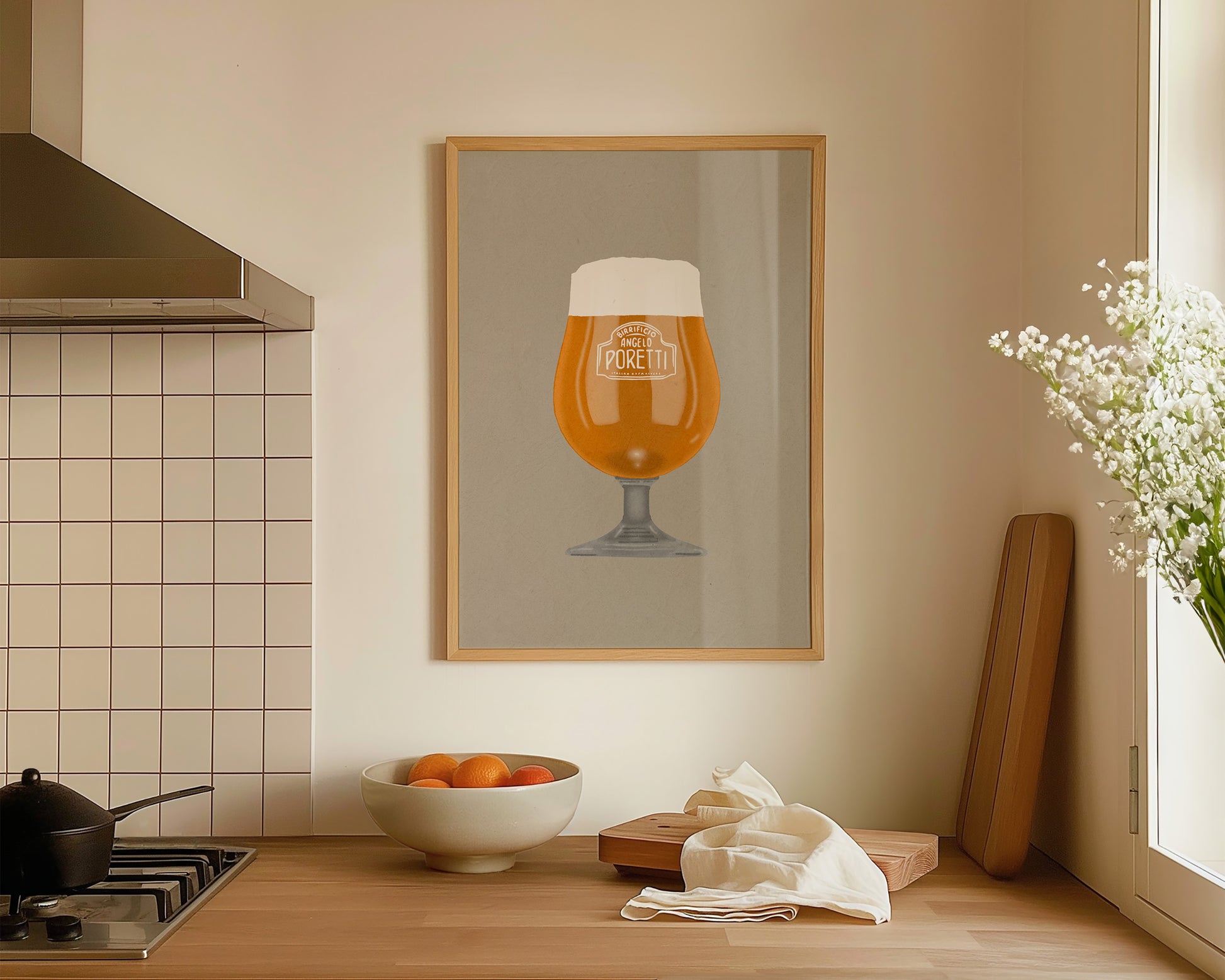 A beer print featuring hand drawn pint of Poretti, set against a pale green/grey background, the perfect modern kitchen print. Printed on archival matte 240gsm paper. Available in multiple sizes, with framed or unframed options. Exclusively designed by one of our artists at our studio.