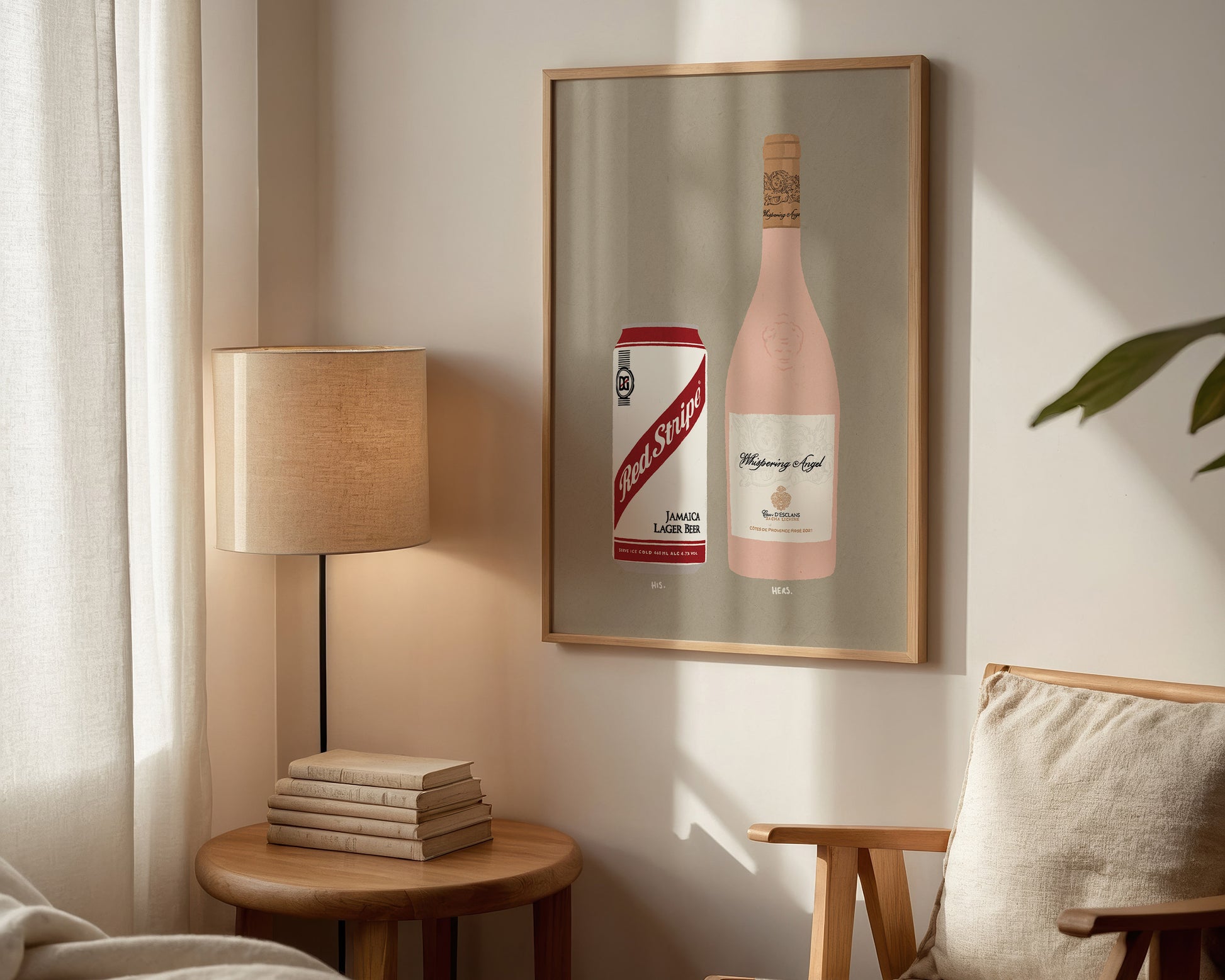 A beer and wine print featuring hand drawn can of Red Stripe alongside a bottle of Whispering Angel, set against a pale green/grey background, the perfect modern kitchen print. Printed on archival matte 240gsm paper. Available in multiple sizes, with framed or unframed options. Exclusively designed by one of our artists at our studio.