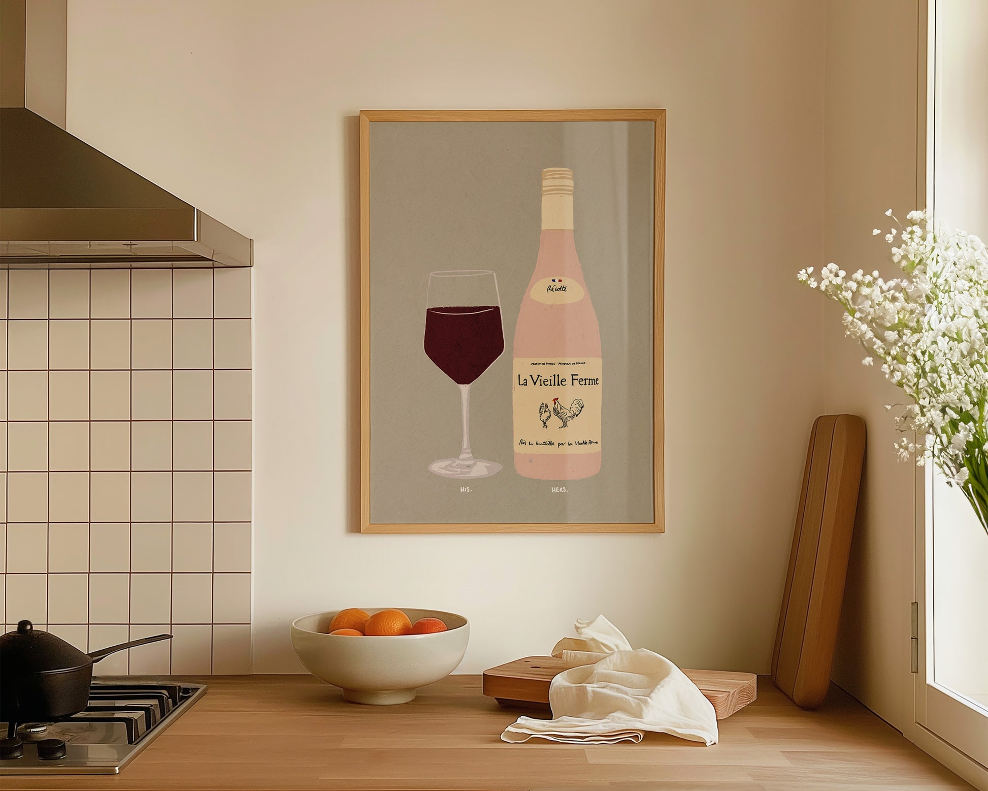 A wine print featuring hand drawn glass of Red Wine alongside a bottle of Chicken Wine, set against a pale green/grey background, the perfect modern kitchen print. Printed on archival matte 240gsm paper. Available in multiple sizes, with framed or unframed options. Exclusively designed by one of our artists at our studio.