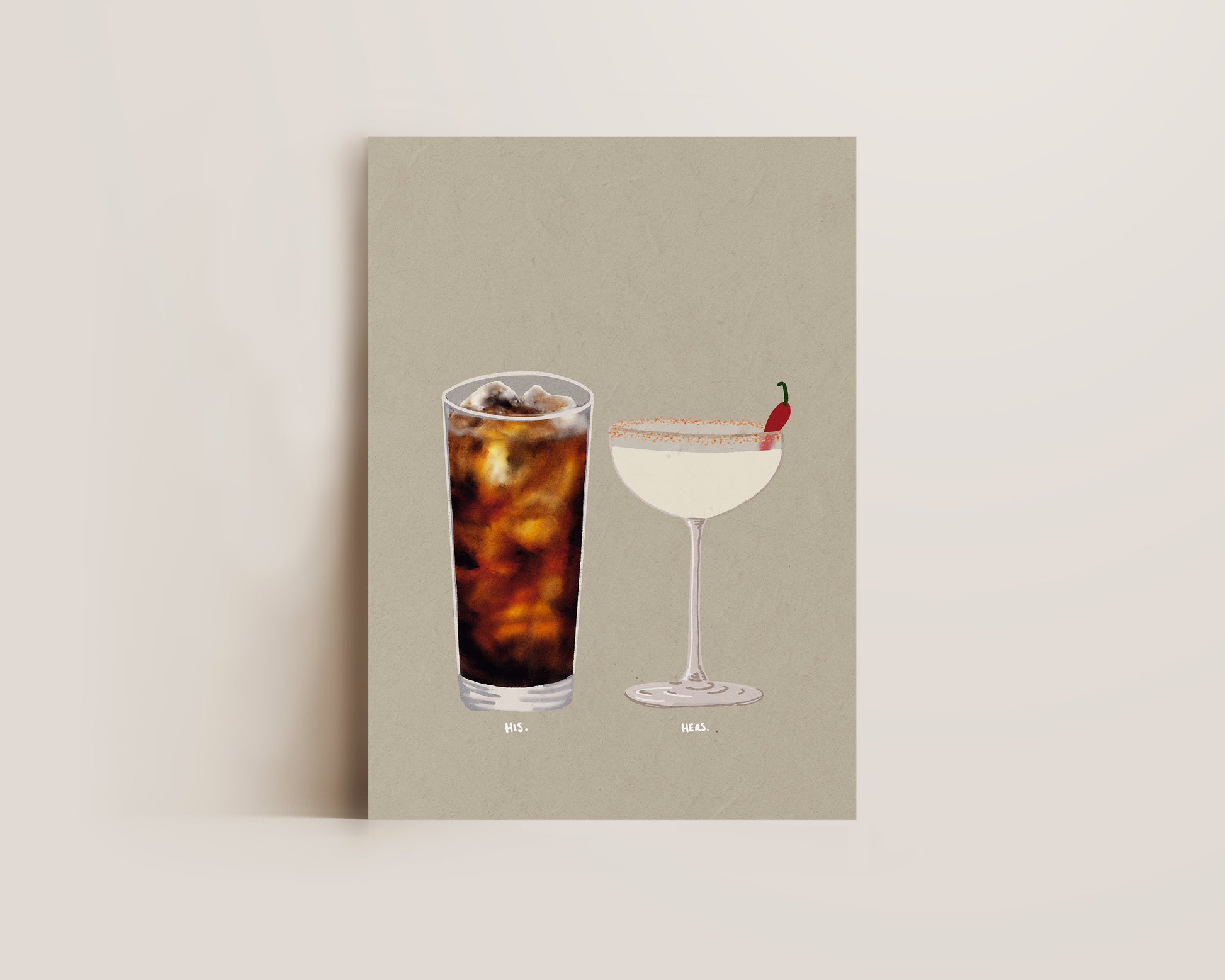 A rum & cocktail print featuring hand drawn glass of Rum and coke alongside a Spicy Margarita cocktail, set against a pale green/grey background, the perfect modern kitchen print. Printed on archival matte 240gsm paper. Available in multiple sizes, with framed or unframed options. Exclusively designed by one of our artists at our studio.