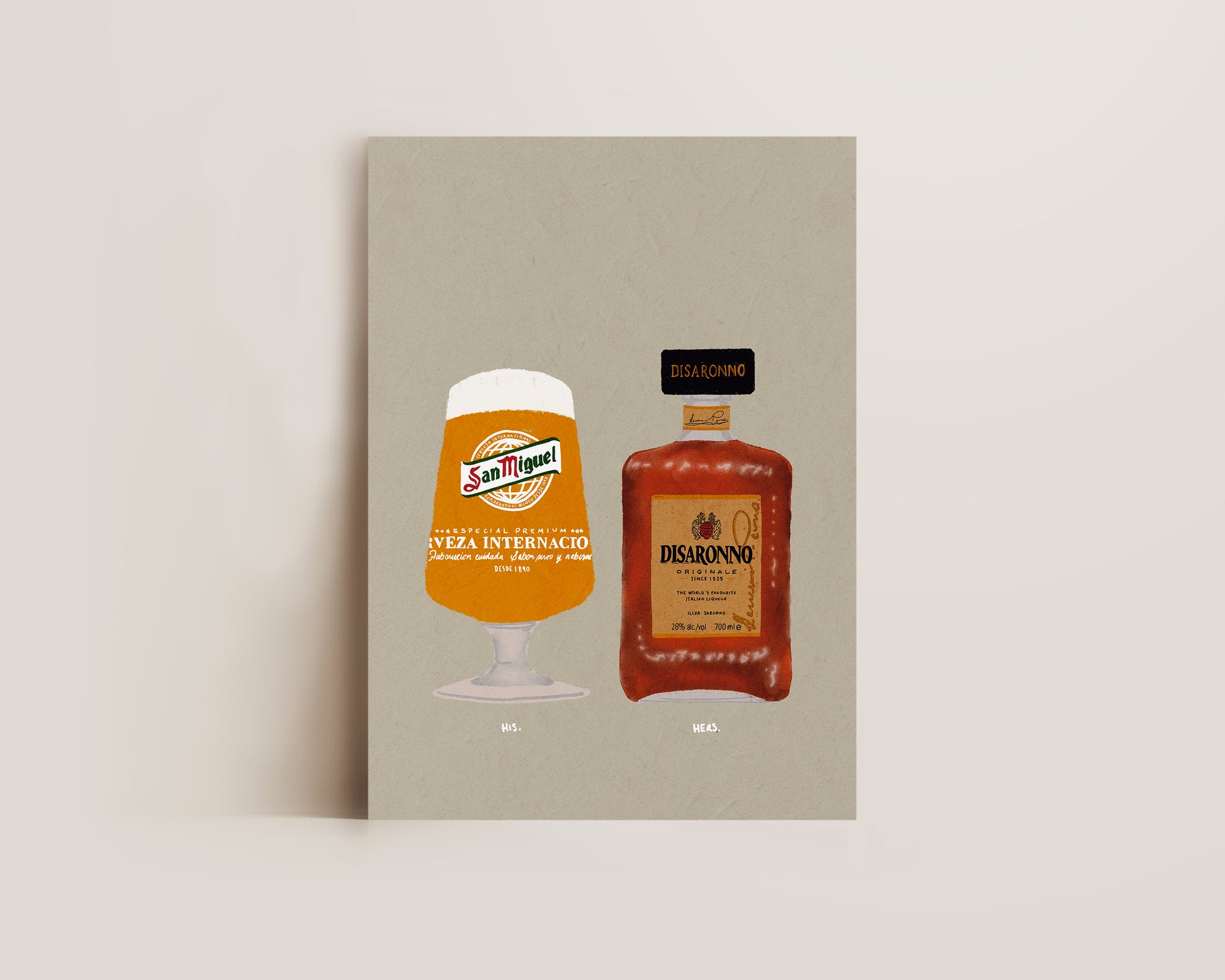 A beer and Disaronno print featuring hand drawn pint of San Miguel alongside a bottle of Disaronno, set against a pale green/grey background, the perfect modern kitchen print. Printed on archival matte 240gsm paper. Available in multiple sizes, with framed or unframed options. Exclusively designed by one of our artists at our studio.