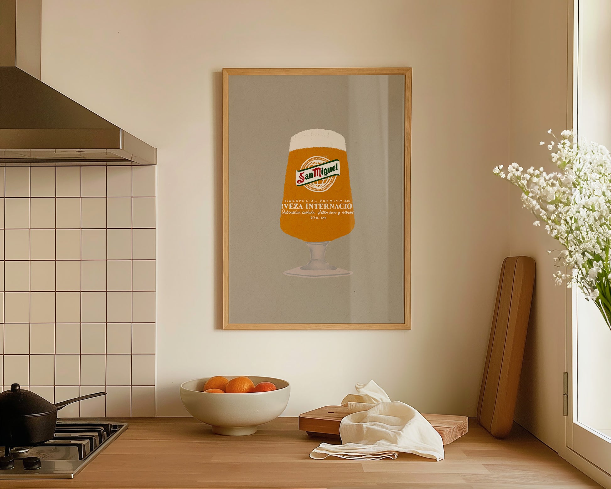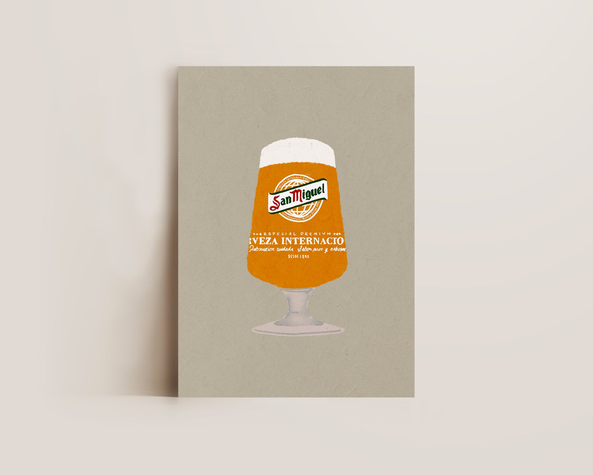 A beer print featuring hand drawn pint of San Miguel, set against a pale green/grey background, the perfect modern kitchen print. Printed on archival matte 240gsm paper. Available in multiple sizes, with framed or unframed options. Exclusively designed by one of our artists at our studio.