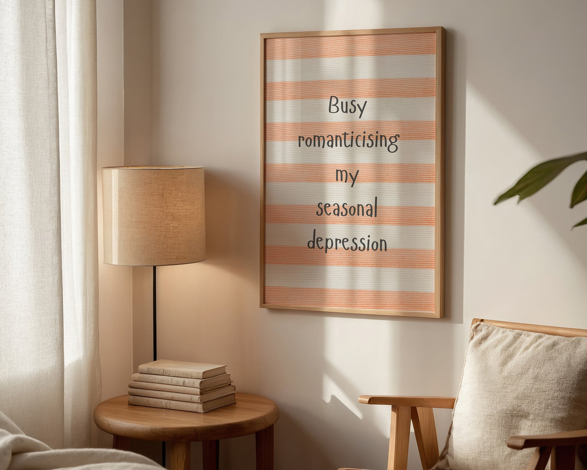 A autumnal quote print featuring "Busy romanticising my seasonal depression" quote, set against a burnt orange striped background, the perfect fall print. Printed on archival matte 240gsm paper. Available in multiple sizes, with framed or unframed options. Exclusively designed by one of our artists at our studio.