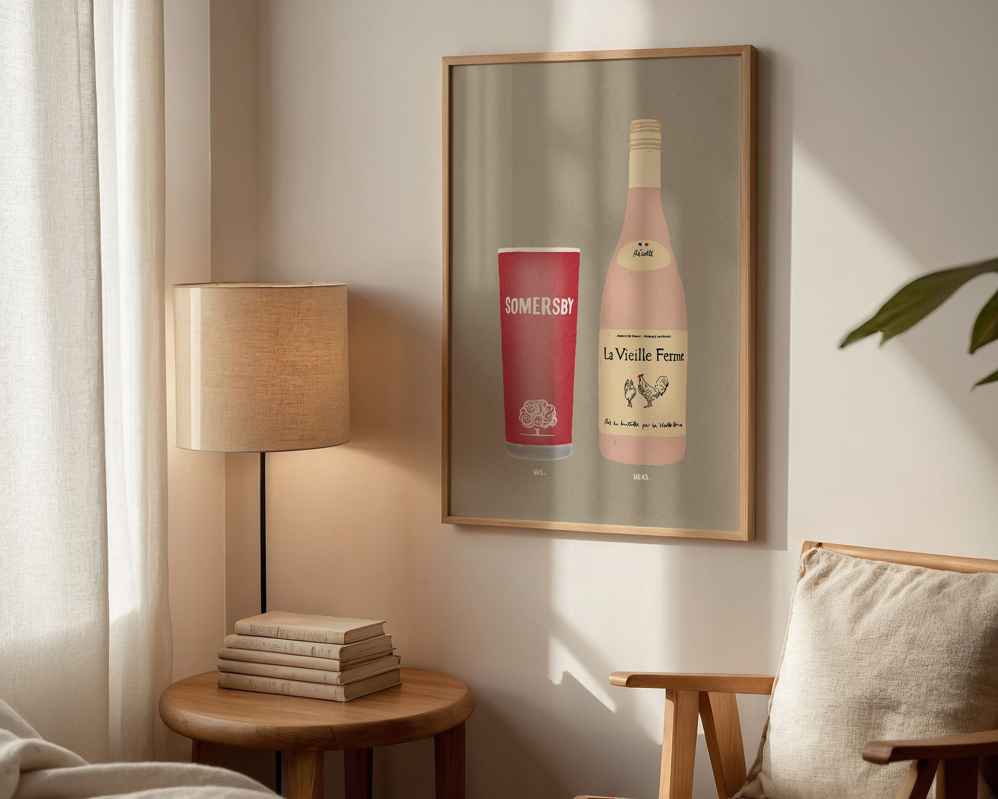 A couples drink print featuring hand drawn pint of Somersby cider alongside a bottle of Chicken Wine, set against a pale green/grey background, the perfect modern kitchen print. Printed on archival matte 240gsm paper. Available in multiple sizes, with framed or unframed options. Exclusively designed by one of our artists at our studio.