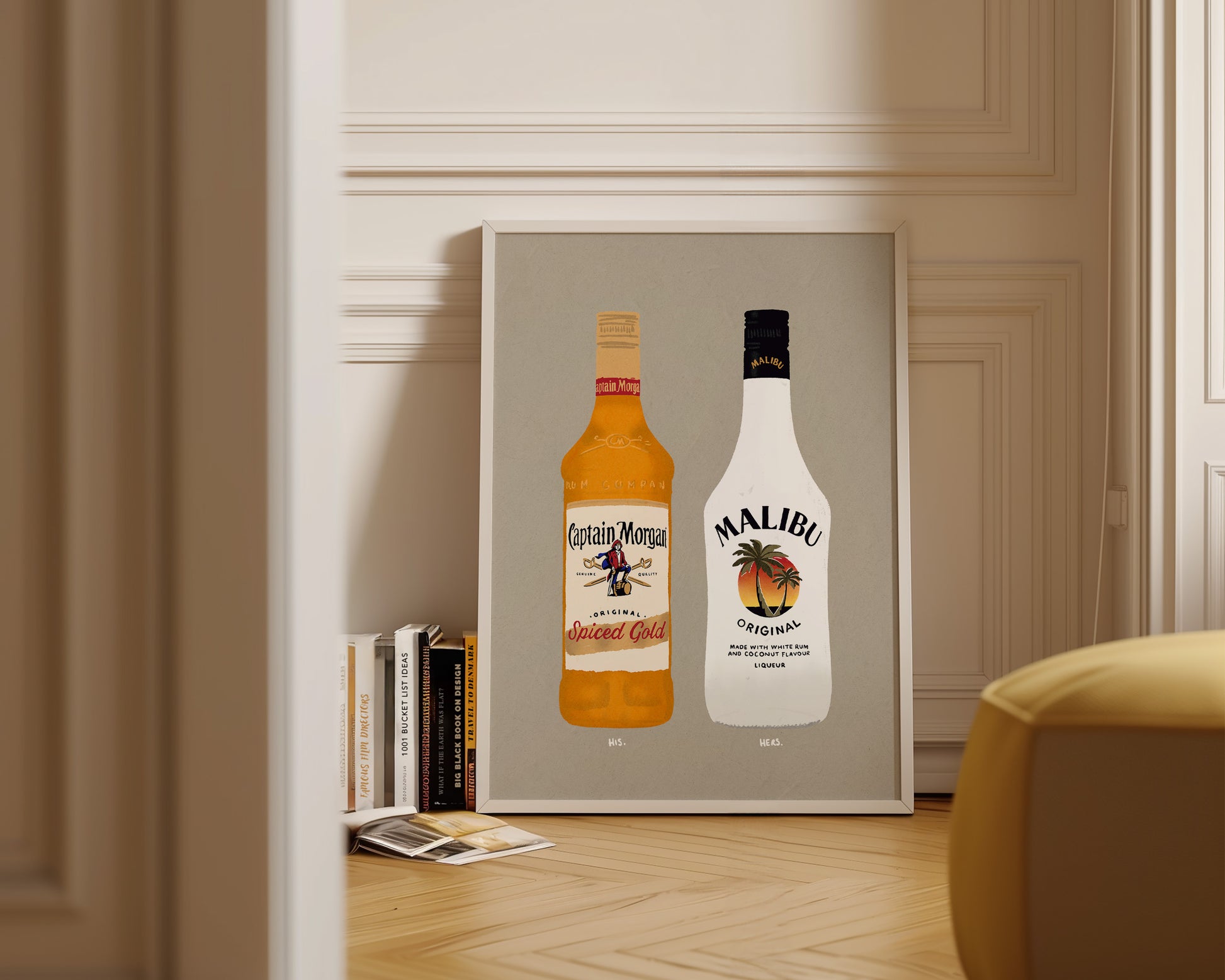 A Spiced Rum and Malibu print featuring hand drawn bottle of Captain Morgan's Spiced Rum alongside a bottle of Malibu, set against a pale green/grey background, the perfect modern kitchen print. Printed on archival matte 240gsm paper. Available in multiple sizes, with framed or unframed options. Exclusively designed by one of our artists at our studio.