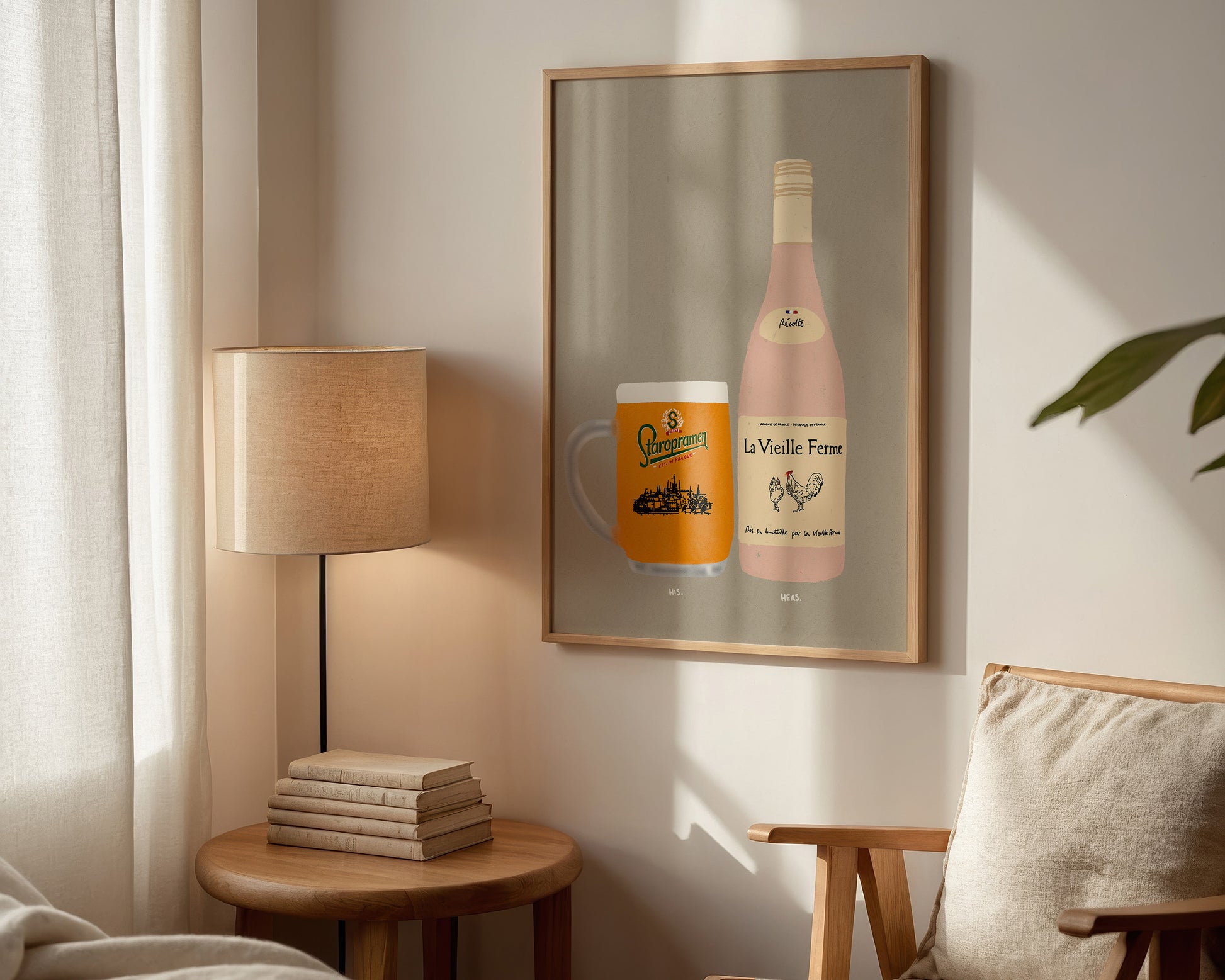 A Staropramen & Chicken Wine print featuring hand drawn pint of Staropramen alongside a bottle of Chicken Wine, set against a pale green/grey background, the perfect modern kitchen print. Printed on archival matte 240gsm paper. Available in multiple sizes, with framed or unframed options. Exclusively designed by one of our artists at our studio.