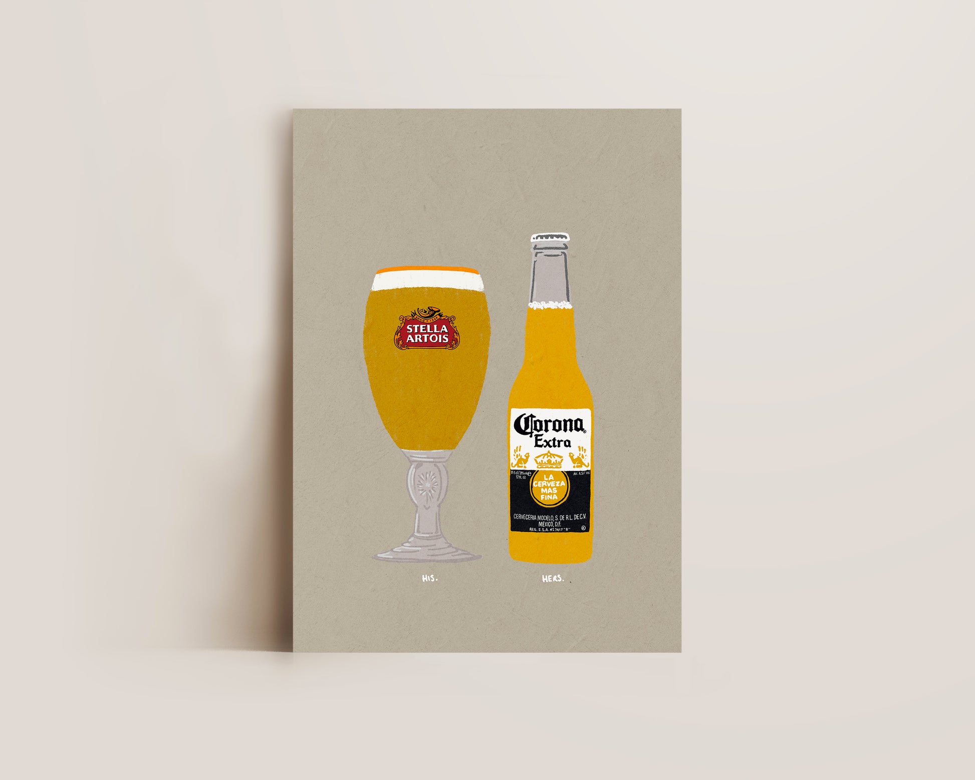 A beer print featuring hand drawn pint of Stella alongside a bottle of Corona, set against a pale green/grey background, the perfect modern kitchen print. Printed on archival matte 240gsm paper. Available in multiple sizes, with framed or unframed options. Exclusively designed by one of our artists at our studio.