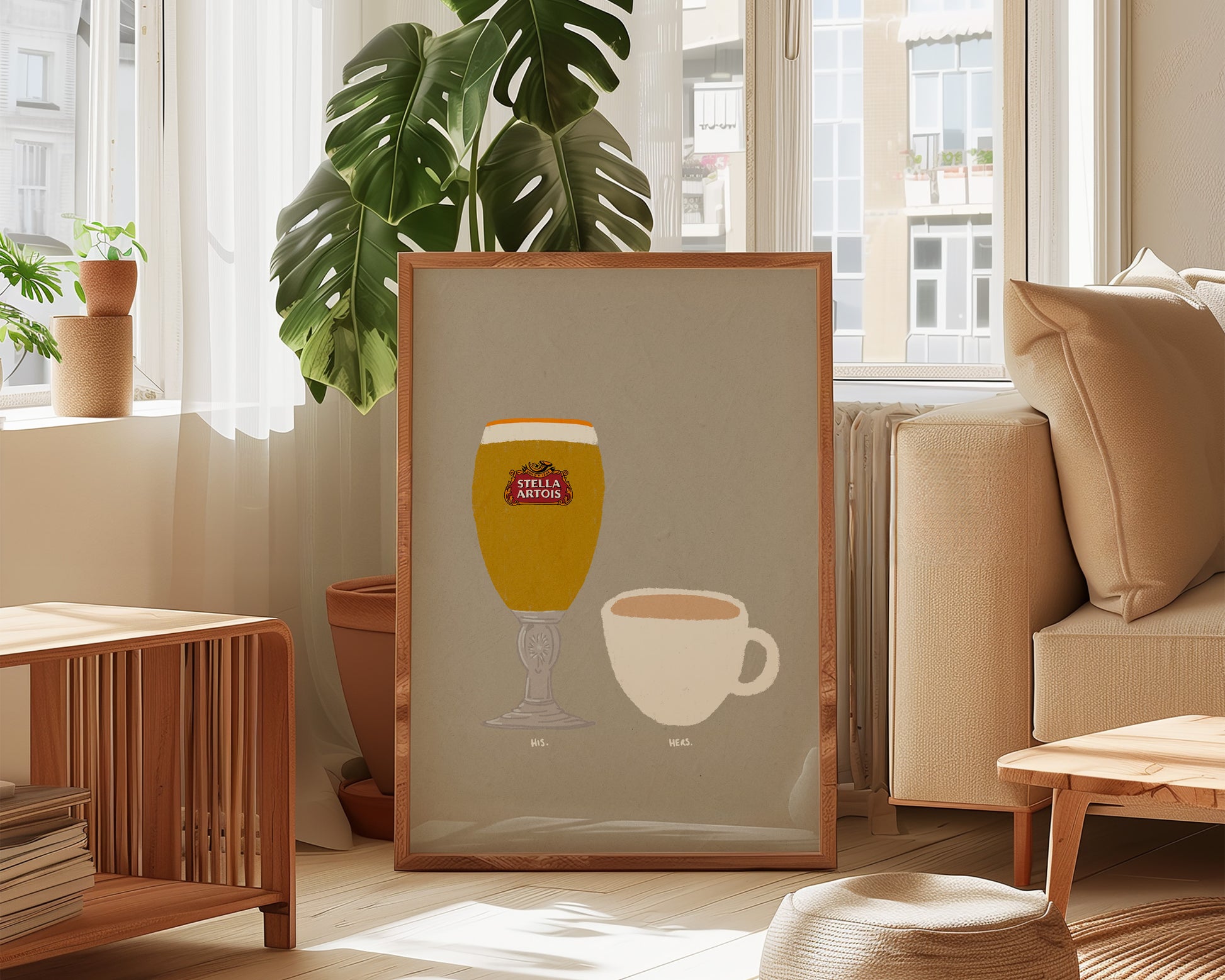 A beer and tea print featuring hand drawn pint of Stella alongside a Cup of Tea, set against a pale green/grey background, the perfect modern kitchen print. Printed on archival matte 240gsm paper. Available in multiple sizes, with framed or unframed options. Exclusively designed by one of our artists at our studio.