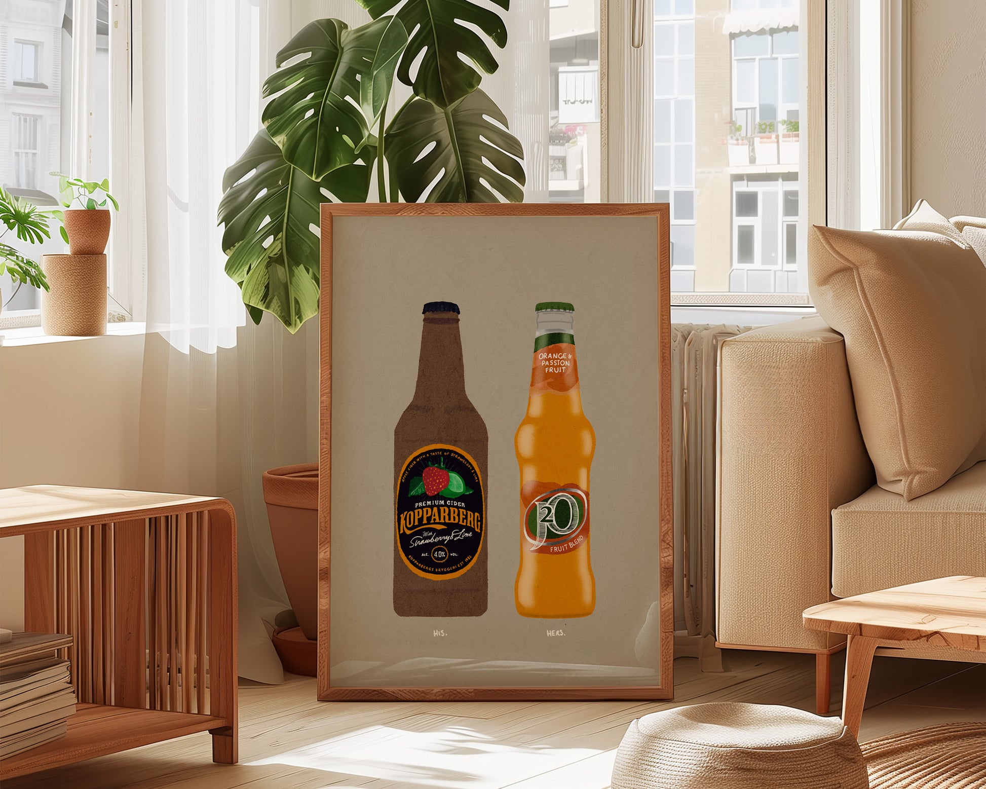 A couples drinks print featuring hand drawn bottle of Strawberry Lime Kopparberg alongside a bottle of J20 Orange, set against a pale green/grey background, the perfect modern kitchen print. Printed on archival matte 240gsm paper. Available in multiple sizes, with framed or unframed options. Exclusively designed by one of our artists at our studio.