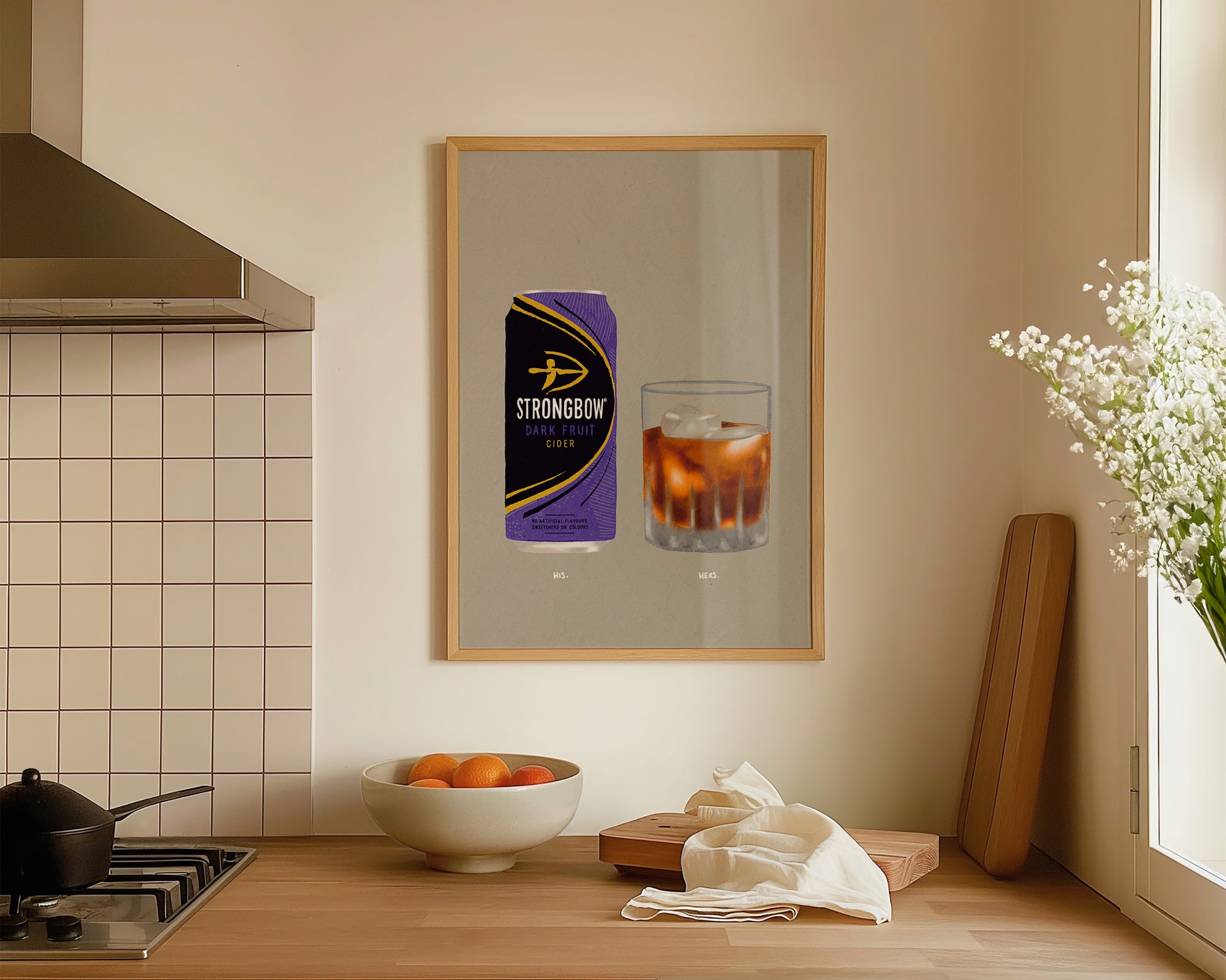 A cider & cocktail print featuring hand drawn can of Strongbow Dark Fruits alongside a Black Russian cocktail, set against a pale green/grey background, the perfect modern kitchen print. Printed on archival matte 240gsm paper. Available in multiple sizes, with framed or unframed options. Exclusively designed by one of our artists at our studio.