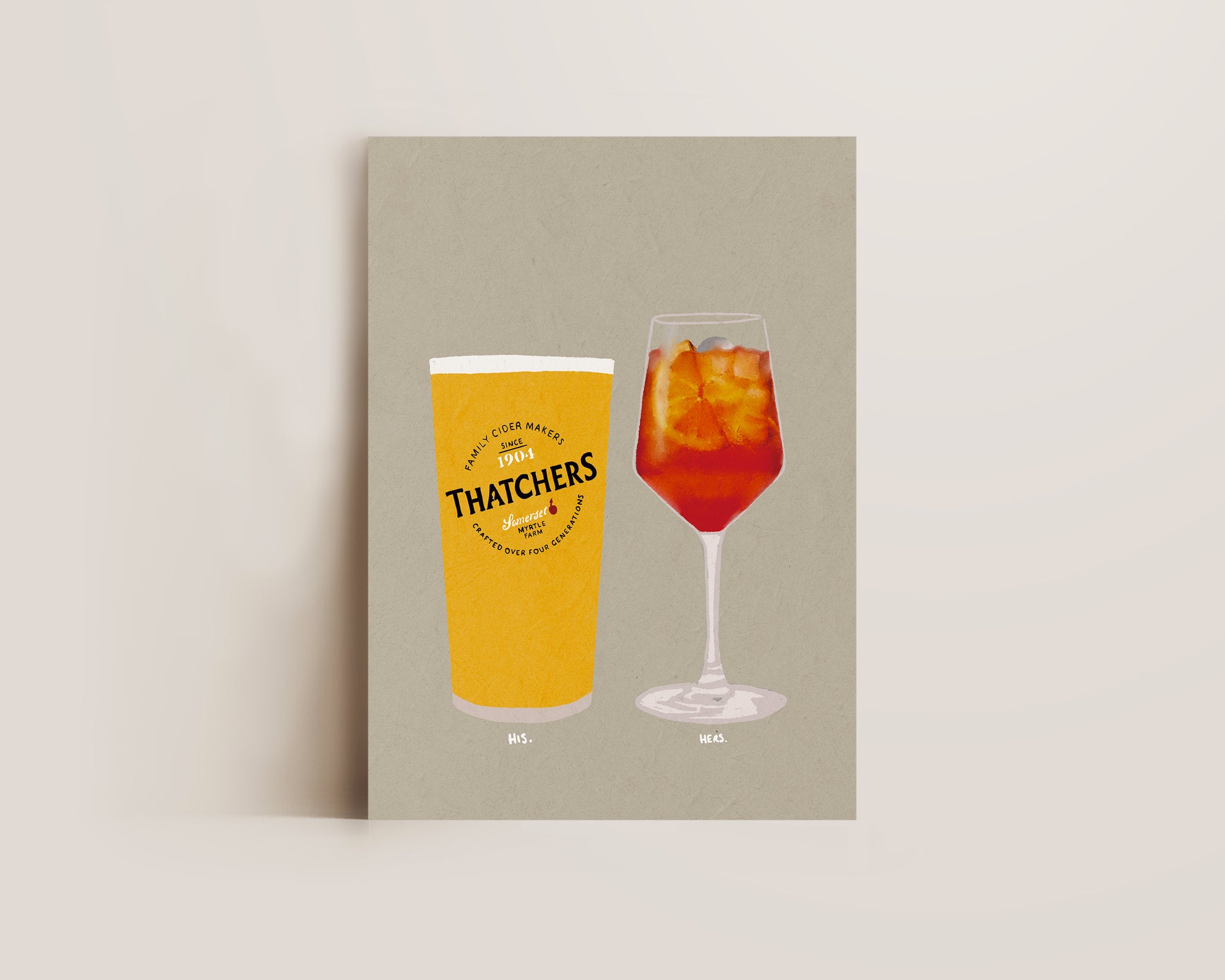A cider and cocktail print featuring hand drawn pint of Thatchers alongside an Aperol Spritz cocktail, set against a pale green/grey background, the perfect modern kitchen print. Printed on archival matte 240gsm paper. Available in multiple sizes, with framed or unframed options. Exclusively designed by one of our artists at our studio.