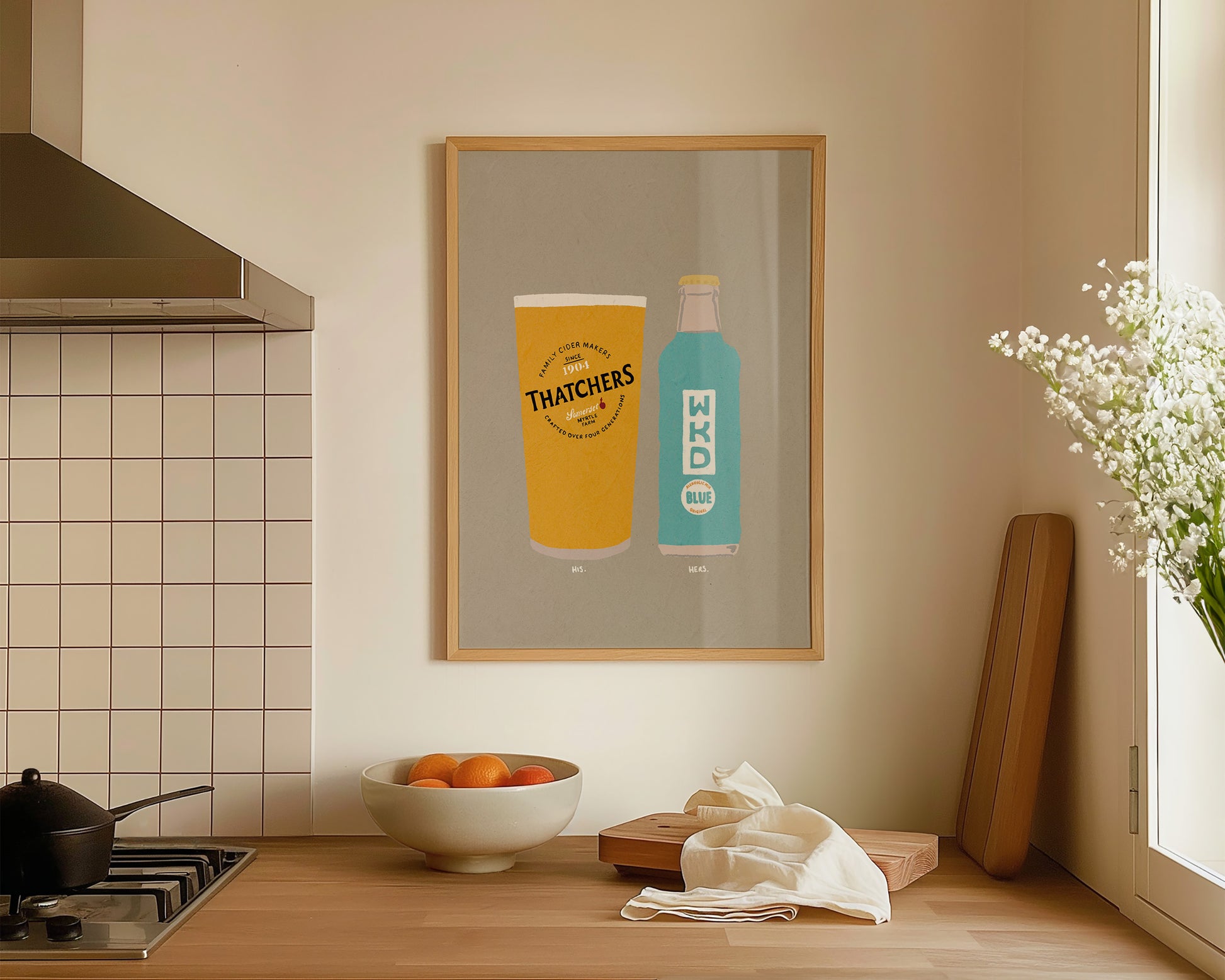 A cider and WKD Blue print featuring hand drawn pint of Thatchers alongside a bottle of WKD Blue, set against a pale green/grey background, the perfect modern kitchen print. Printed on archival matte 240gsm paper. Available in multiple sizes, with framed or unframed options. Exclusively designed by one of our artists at our studio.
