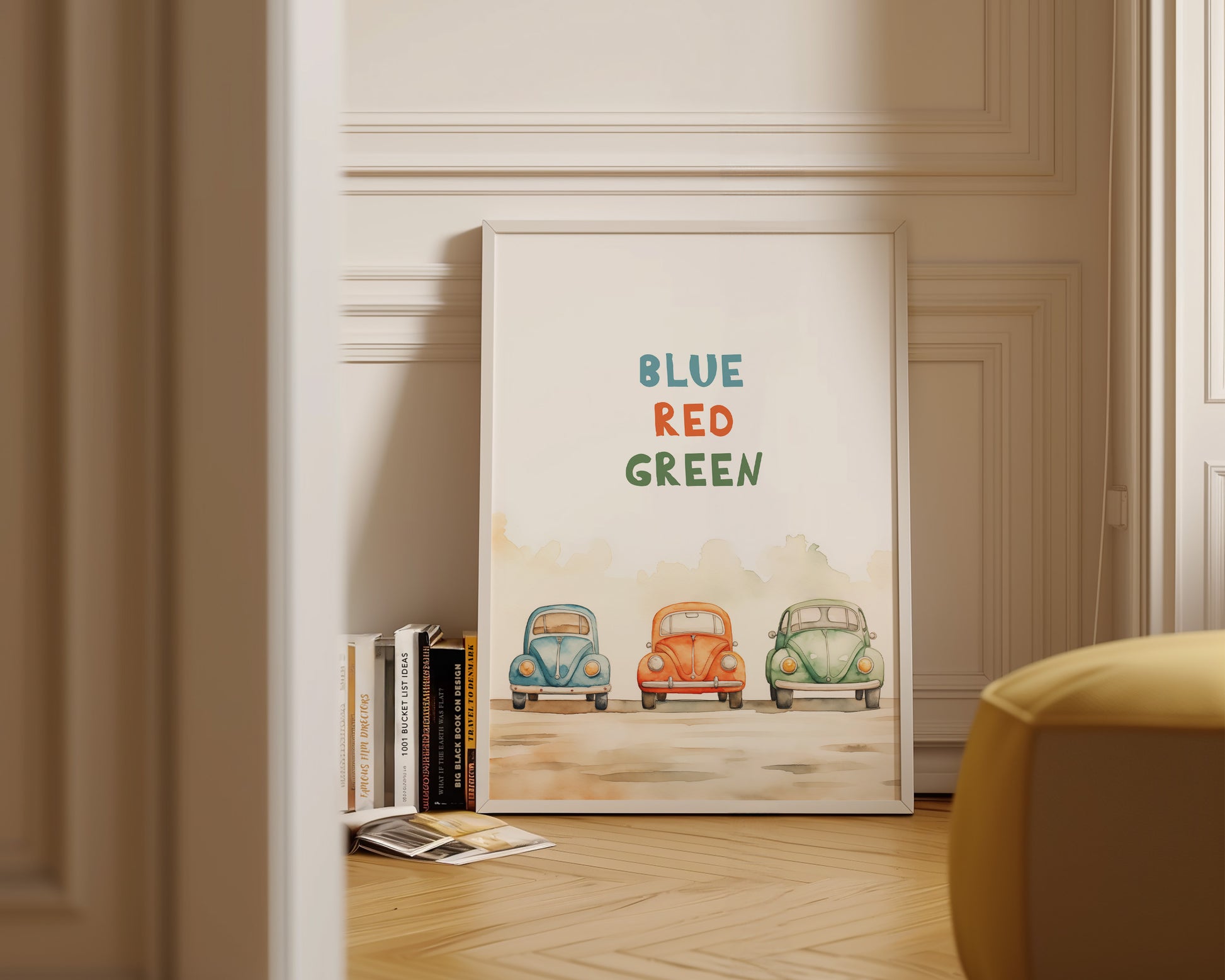 A nursery print featuring three hand drawn colourful cars. The perfect kids room wall decor. Printed on archival matte 240gsm paper. Available in multiple sizes, with framed or unframed options. Exclusively designed by one of our artists at our studio.