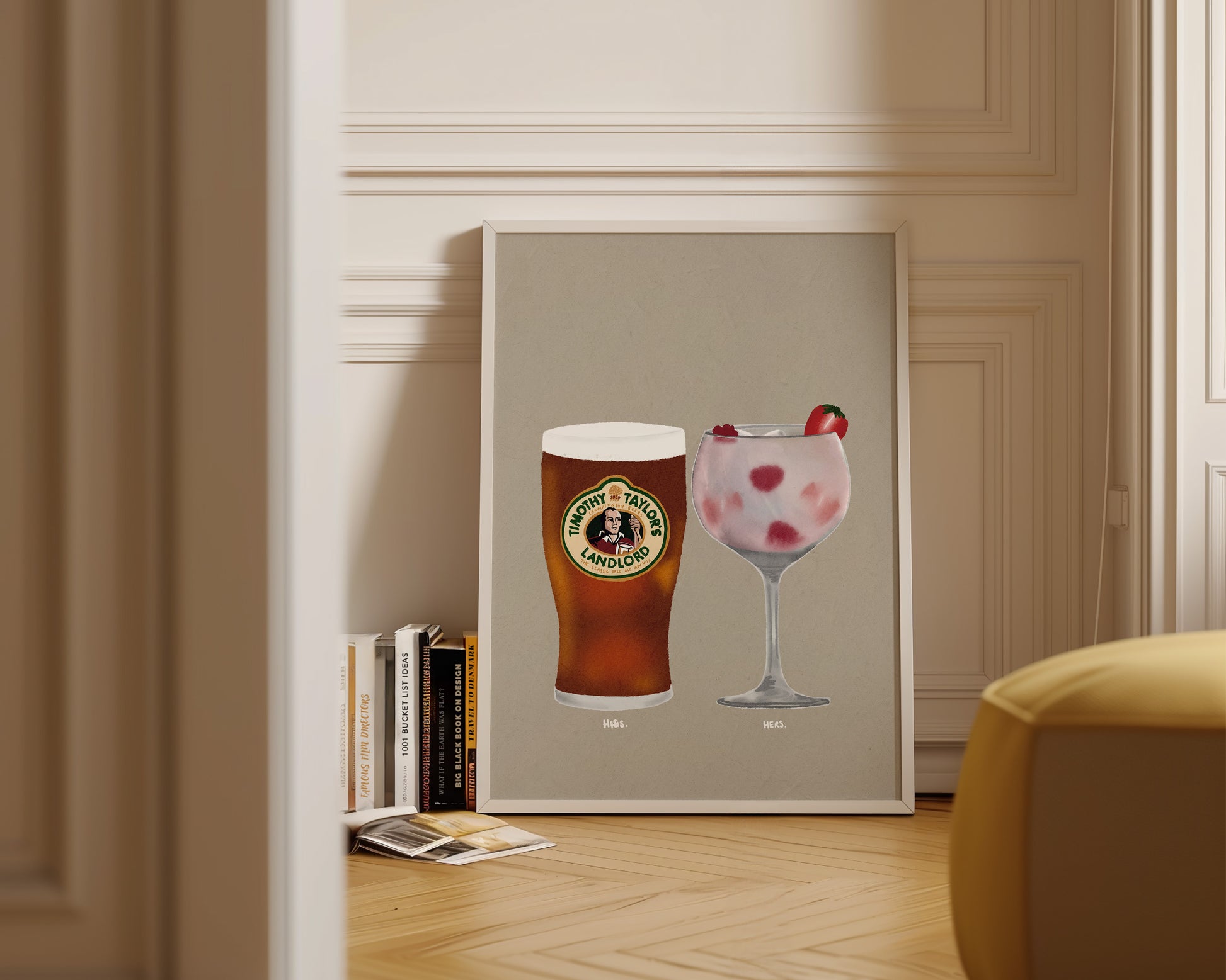A Timothy Taylor's & Pink Gin print featuring hand drawn pint of Timothy Taylor's alongside a glass of Pink Gin, set against a pale green/grey background, the perfect modern kitchen print. Printed on archival matte 240gsm paper. Available in multiple sizes, with framed or unframed options. Exclusively designed by one of our artists at our studio.