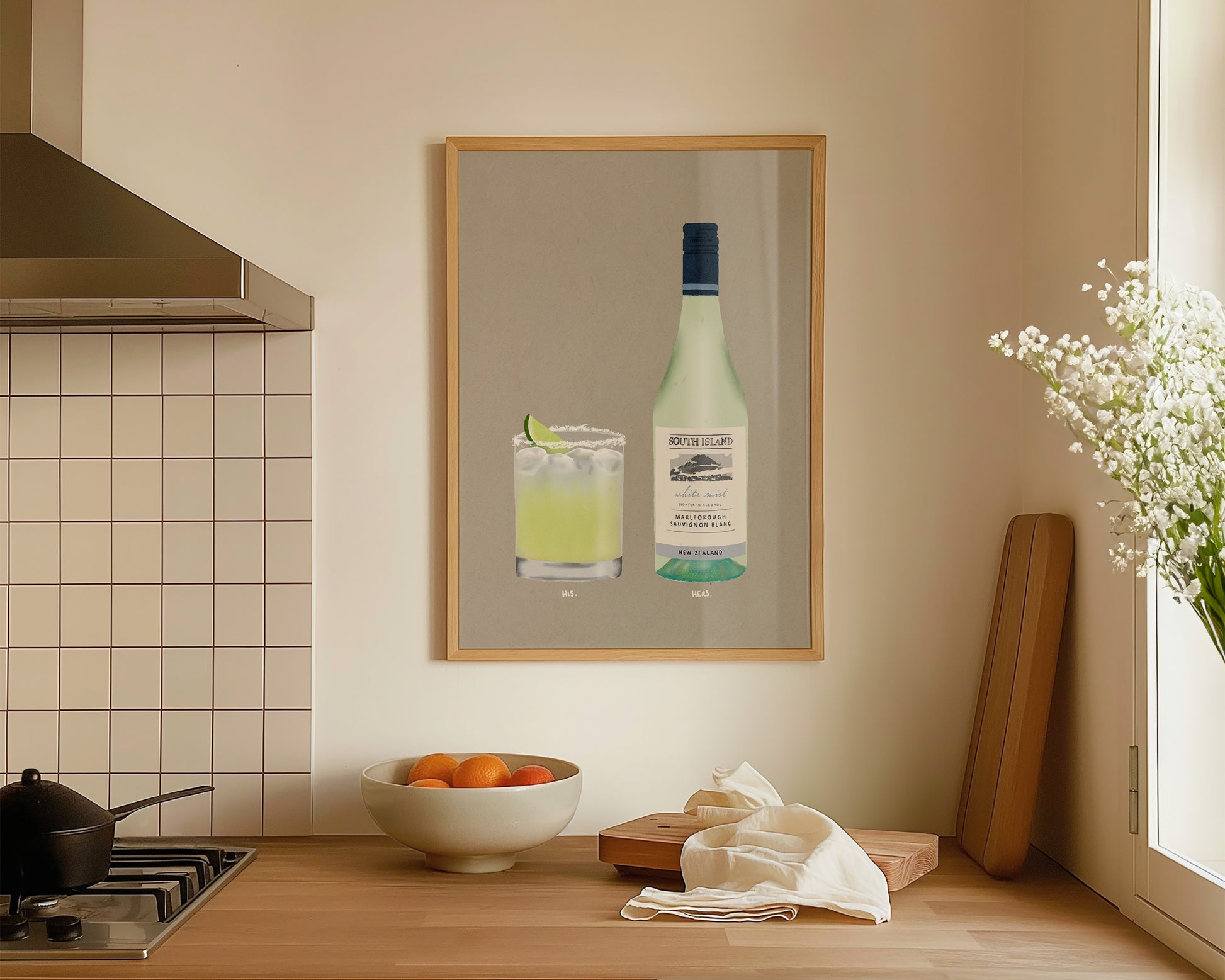 A cocktail and wine print featuring hand drawn Tommy's Marg alongside a bottle of South Island Sauvignon Blanc, set against a pale green/grey background, the perfect modern kitchen print. Printed on archival matte 240gsm paper. Available in multiple sizes, with framed or unframed options. Exclusively designed by one of our artists at our studio.