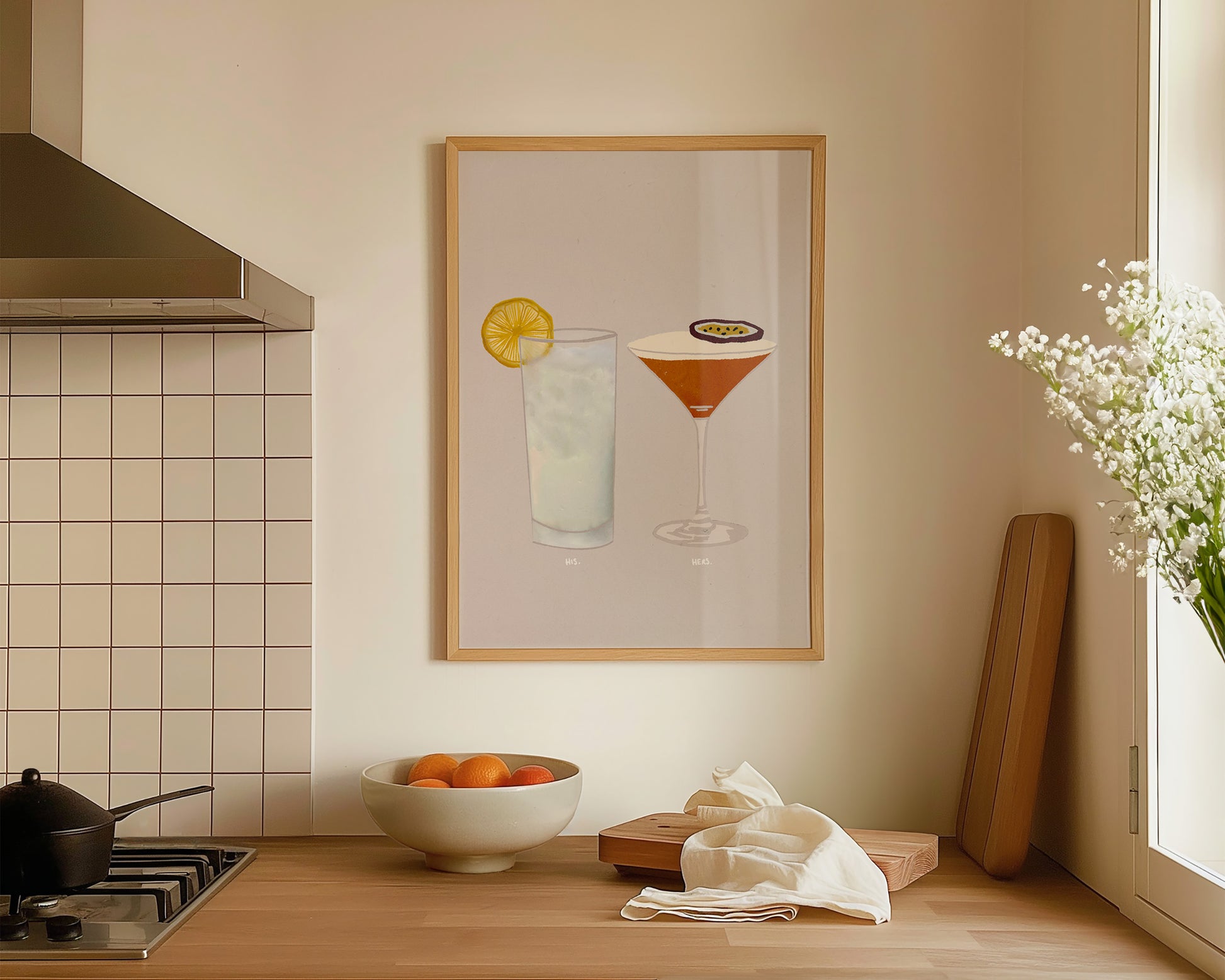 A Vodka Lemonade & Pornstar Martini print featuring hand drawn glass of Vodka Lemonade alongside a Pornstar Martini cocktail, set against a pale grey background, the perfect modern kitchen print. Printed on archival matte 240gsm paper. Available in multiple sizes, with framed or unframed options. Exclusively designed by one of our artists at our studio.