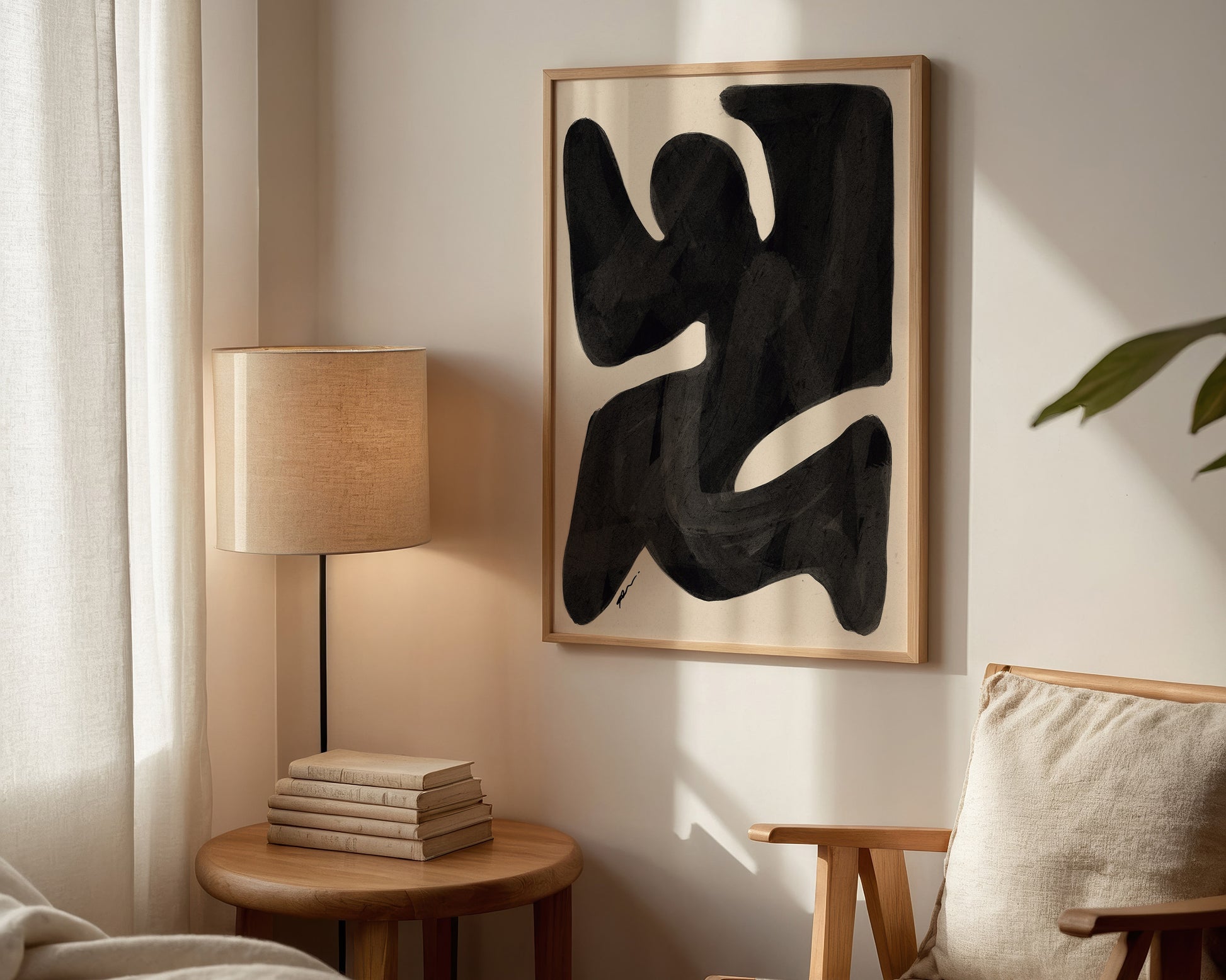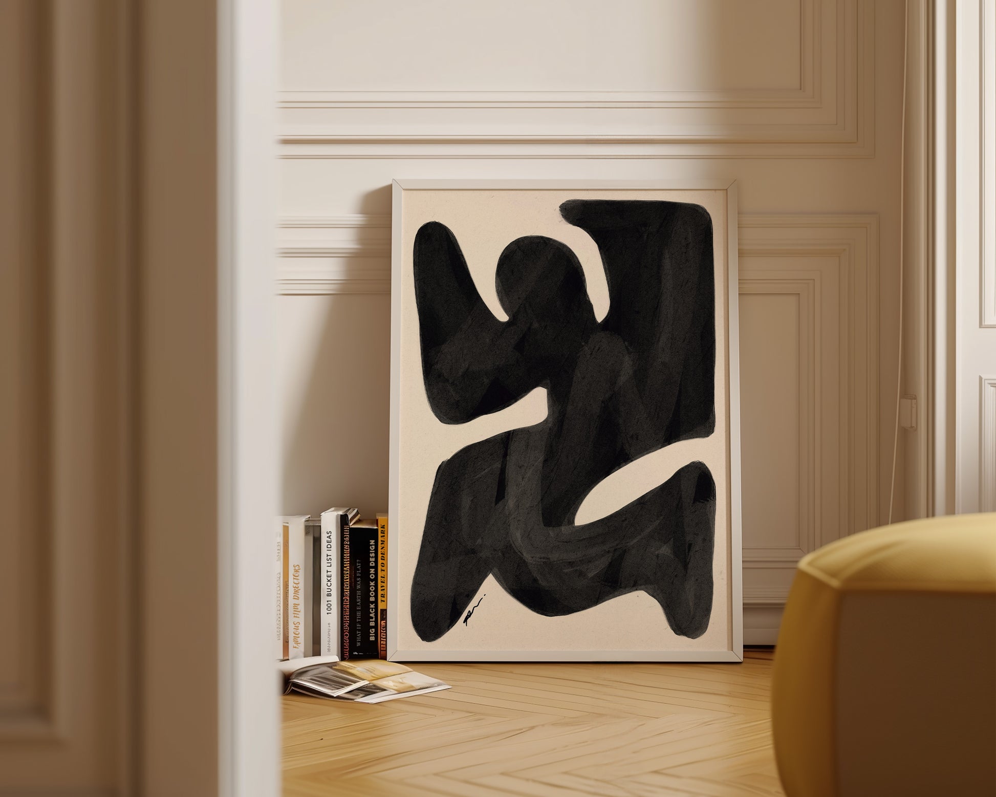 An abstract print featuring a black silhouetted figure, against a beige background. The perfect statement piece for a living room. Printed on archival matte 240gsm paper. Available in multiple sizes, with framed or unframed options. Exclusively designed by one of our artists at our studio.