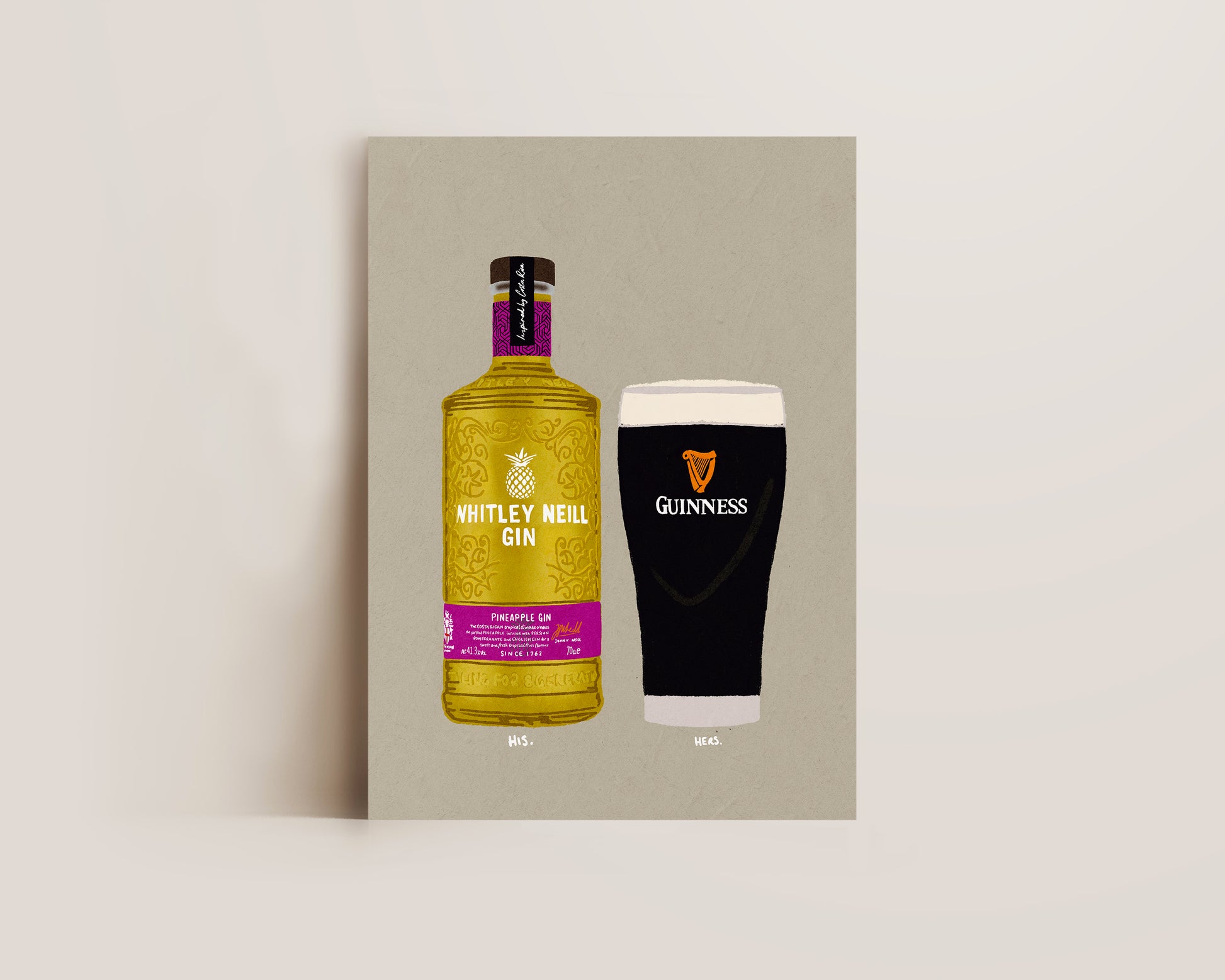 A couples drink print featuring hand drawn bottle of Whitley Neill Pineapple gin alongside a pint of Guinness, set against a pale green/grey background, the perfect modern kitchen print. Printed on archival matte 240gsm paper. Available in multiple sizes, with framed or unframed options. Exclusively designed by one of our artists at our studio.