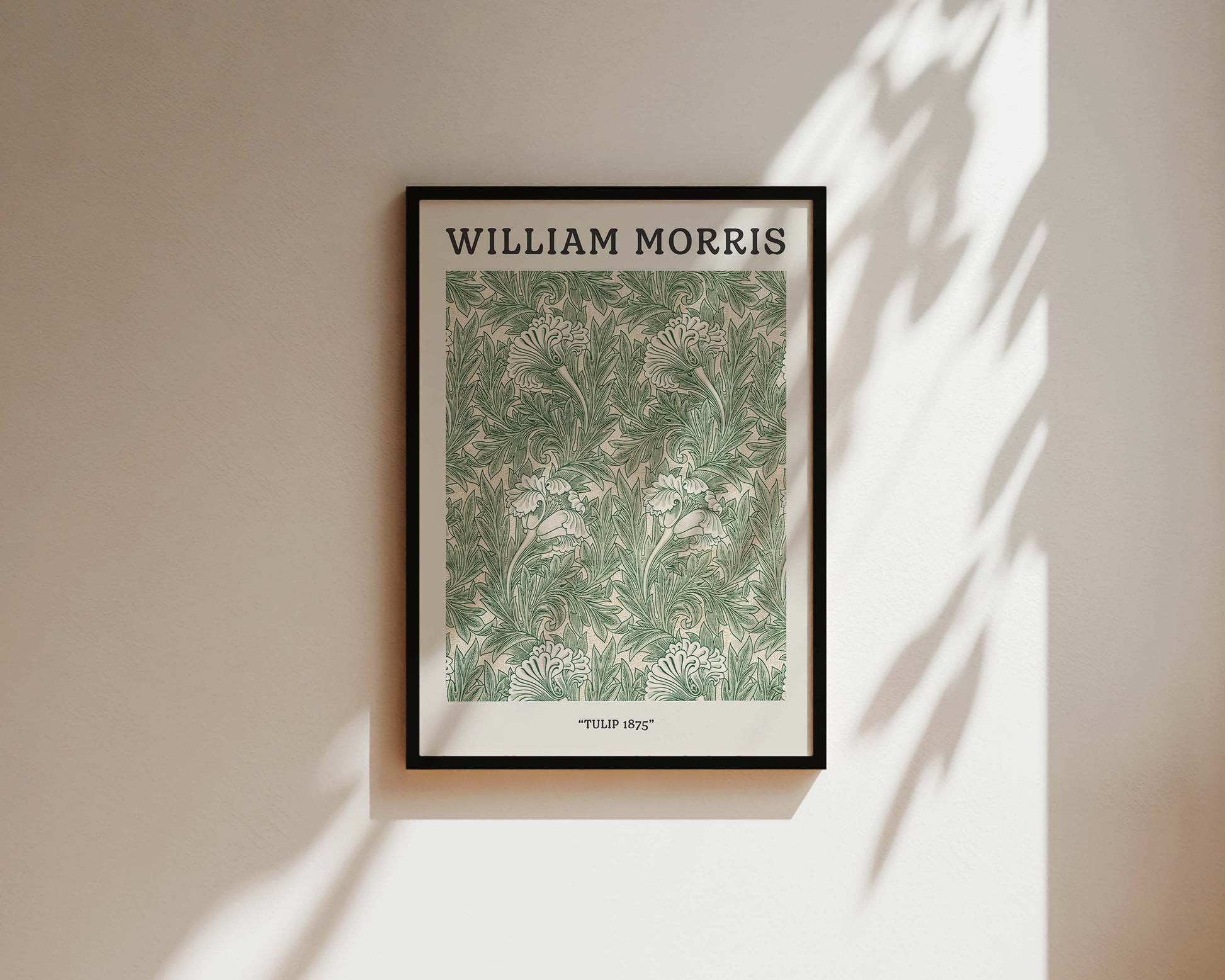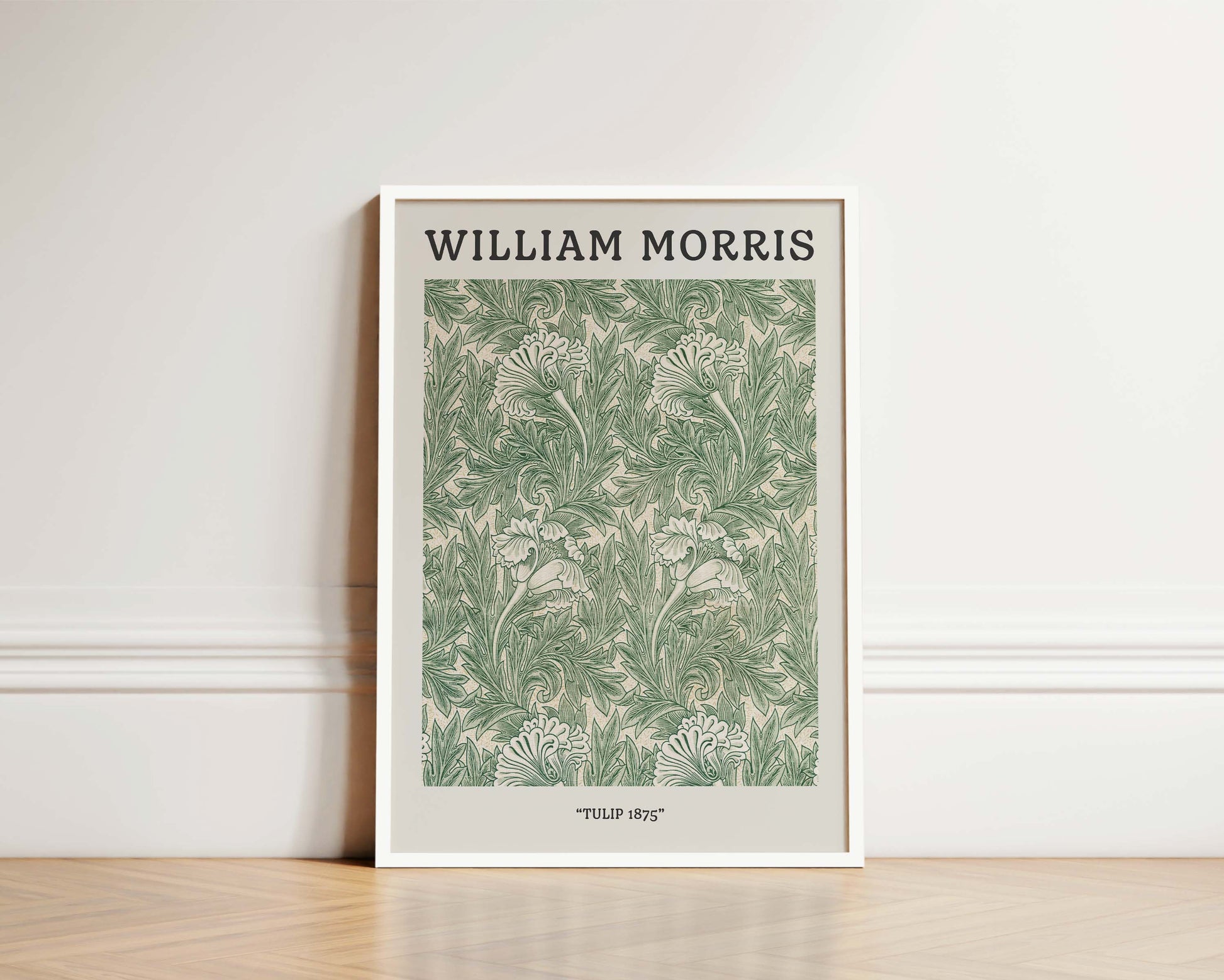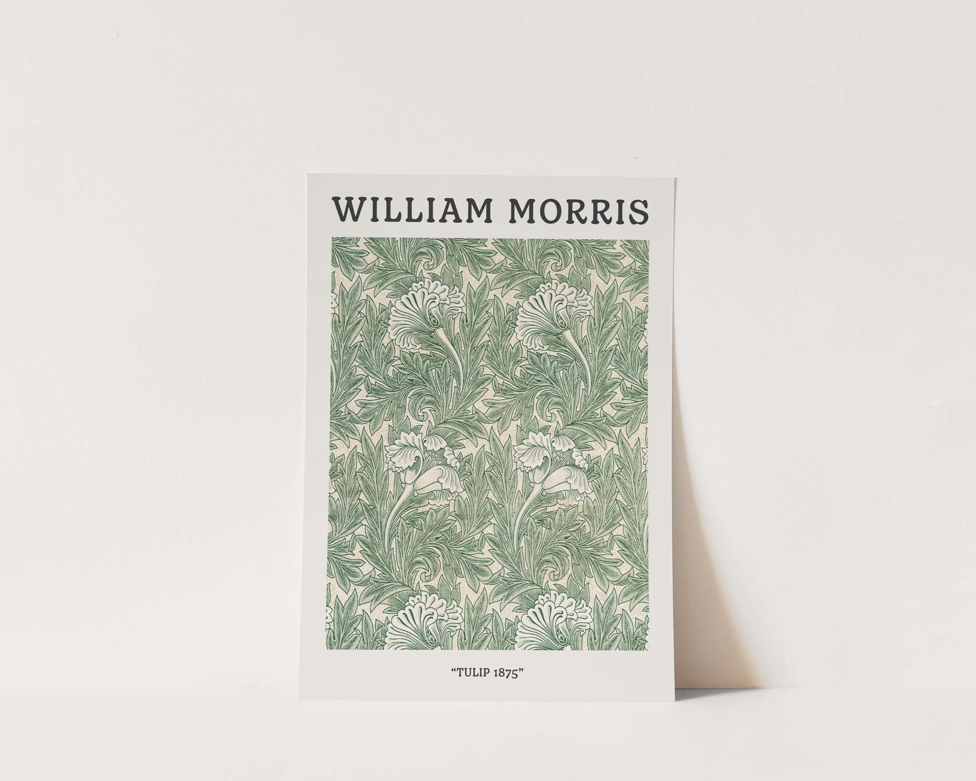 A classic William Morris Tulip 1875 pattern print, featured in a vintage exhibition design. Exclusively designed by one of our artists at our studio.