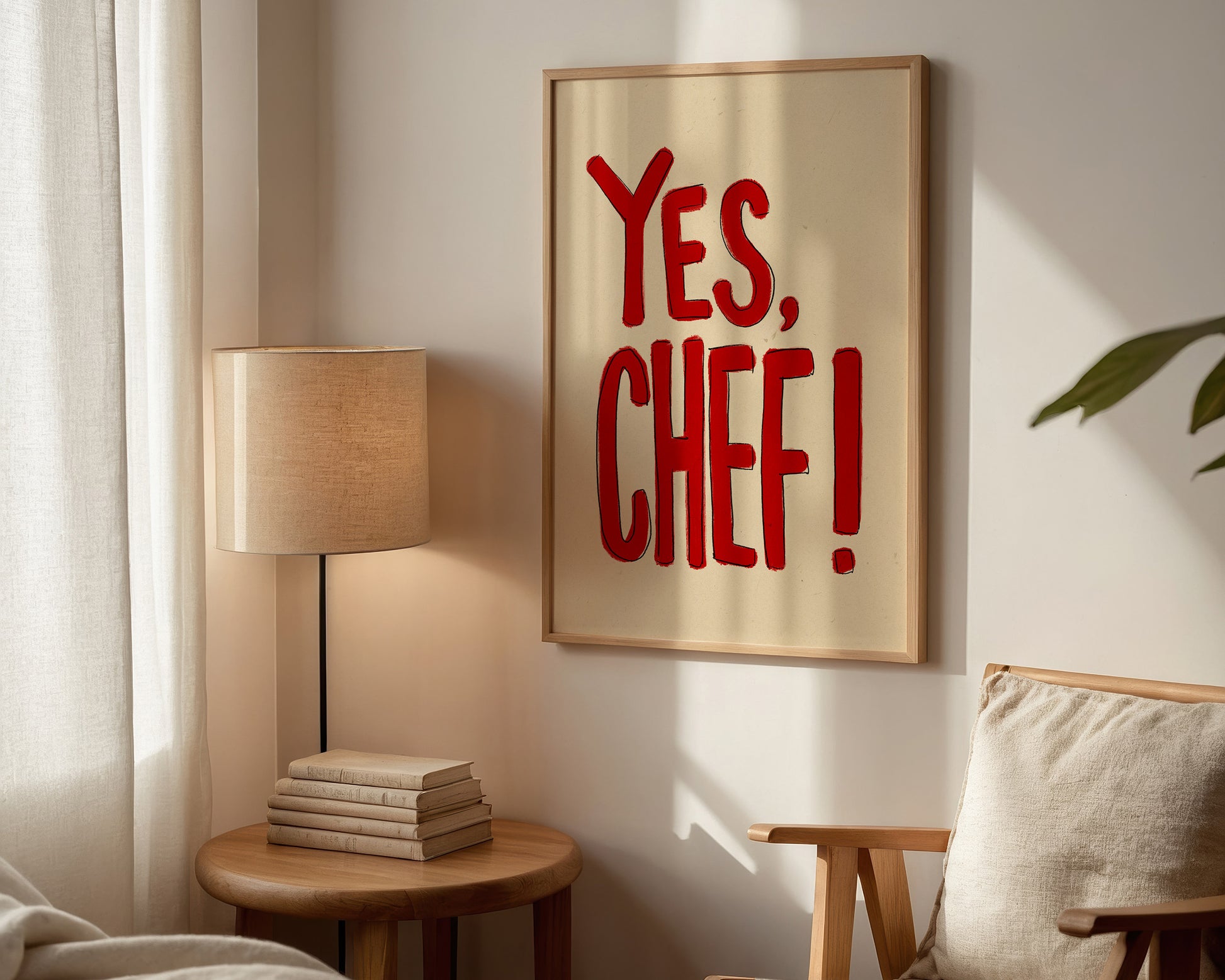 A kitchen print featuring hand drawn "Yes Chef!" quote in red, set against a neutral beige background. The perfect modern kitchen print. Printed on archival matte 240gsm paper. Available in multiple sizes, with framed or unframed options. Exclusively designed by one of our artists at our studio.